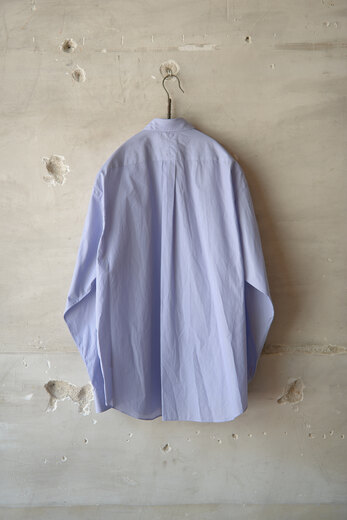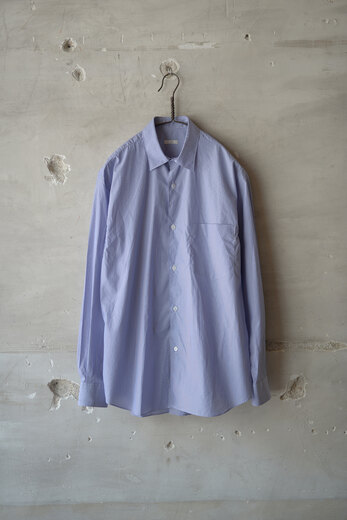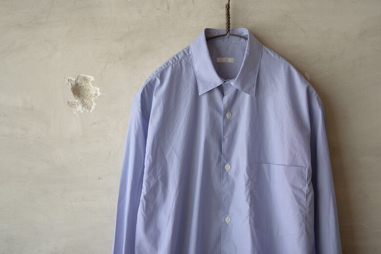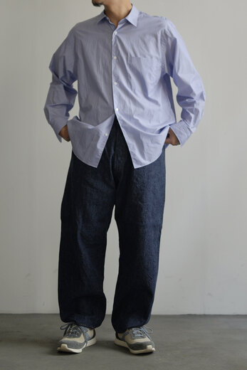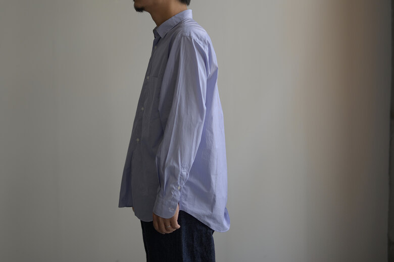 ヨーロッパの古いシャツが店頭に並ぶ事がある。自分で切って縫ったであろう極端に短く直線的な丈の物や綺麗に仕立て直した物、襟をカットした物など・・・。体型も変わるだろうし、気分が変わる事もある。どれも個性的で格好良いと思える物ばかりだった。コモリのポプリンシャツは昔のドレスシャツの丈を少し短くして普段着として使う、そんなイメージが沸いた。ハリのある素材は心地良く、光沢があり細いストライプは上品さも感じられる。そんなポプリンシャツをラフに着る事でその時代のシャツの空気感が出るような気がする。
