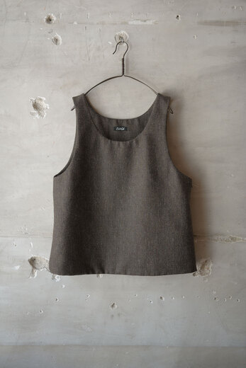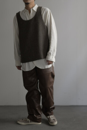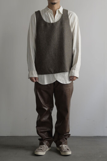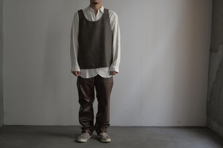 シンプルなプルオーバーベスト。ジャケットと同素材のツイードで中にダウンが少し入っていて暖かく、サイドのジップを開閉して着脱する。この言葉だけだととても機能的で都会的なベストだと感じるがタンクトップの様なデザインに違和感を感じ、そこが気になって気になって仕方なくなりお店に並べる事にした。クタっとしたシャツでもジャケットの上でも下でも、ボロボロのスウェットでも、何故かバランスが良くて上品に見えた。そしてその違和感がちょっと面白く、何か良いなと思わせてくれる。絵に描いたような平面的な見た目とは裏腹に実はとても使い勝手が良いベストなのだ。そして持っていて良かった、と思える時が来るような気がする。
