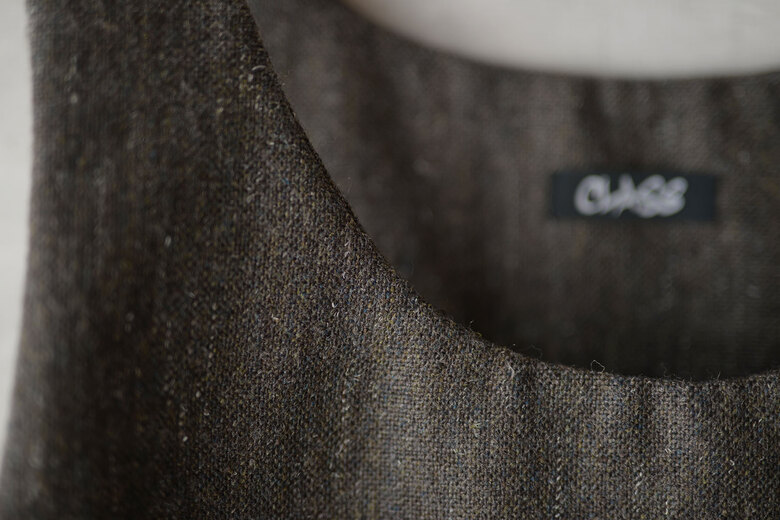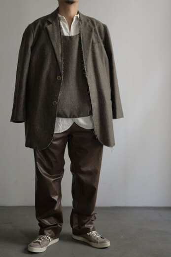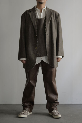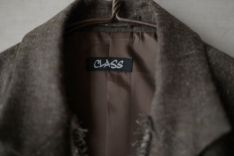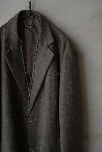 クラシックな雰囲気のツイードにナイロン糸を織り交ぜた素材、光の当たり具合によって少しキラキラする。ゆったりしたテーラードジャケット??ジャケットではあるけど、コートの様でもある。肩がグッと落ちて、まるで古いヴィンテージのコートを羽織っている様な感覚になる。ゆったりしているから中に色々着る事ができて、どうやって着ようか頭の中をグルグルと掻き立てられる。洋服を前にして一呼吸置いて、そして何度か着ていく内に本当に意味で自分の物になる。それがまた楽しいし、気分が上がる。CLASSとはファッションをファッションとして純粋に楽しめる洋服ではないでしょうか。