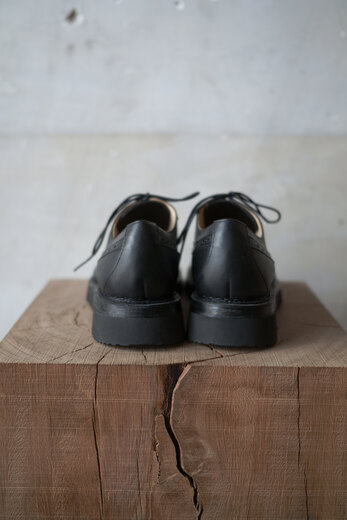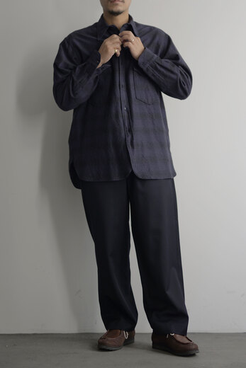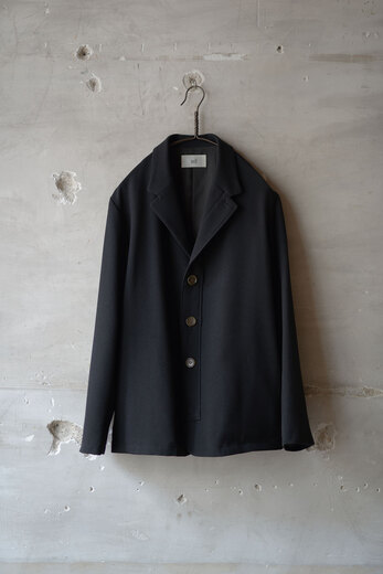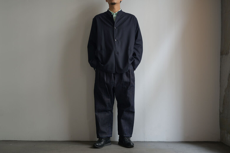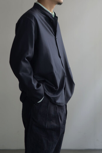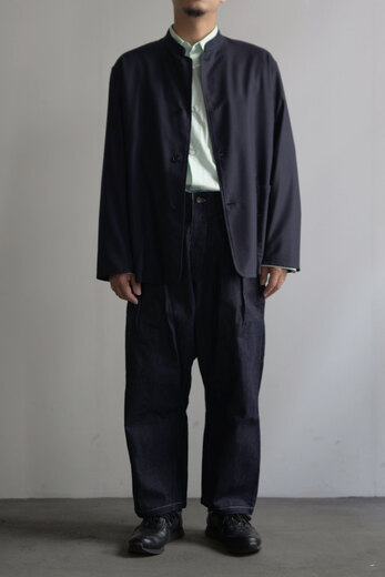 コモリの洋服は古いミリタリーをベースにデザインされている事が多い。軍物には様々な場面で使い易い事や可動域が広くて動きやすかったり、一つ一つ意味があり役割のある機能美が魅力な所でもある。このジャケットも古いミリタリーから着想を得ているが、削ぎ落とされたミニマムなデザインに上質なウールフラノを使う事によってより研ぎ澄まされた様な気がした。ちょっと綺麗に見せる事もできるし、崩してラフにも着れる。見た目は綺麗だけど、そんな気楽さもあるジャケットだ。