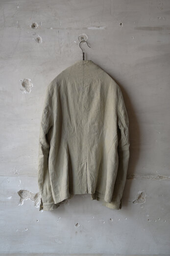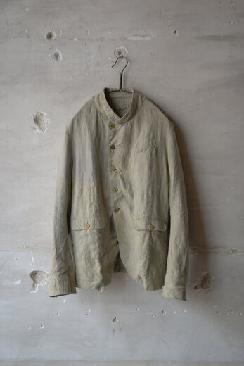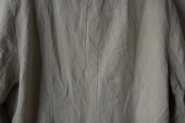PROJECT by Hは毎回染めが面白い。今までにはインディゴや墨、玉ねぎの皮を使っていた。天然の染料である事と染める季節や天気などにも左右される為、サンプルや生地スワッチで見るのと実際に洋服になったのでは、想像していた色と違う事もある。だからお店に届いて箱から出す時はドキドキではなくワクワクする瞬間だ。今回の新型のスタンドカラージャケットは空気を含んだような柔らかいリネンにターメリックと墨を使って染めている。この色も良い意味で想像を裏切られた色だった。何とも言えない曖昧な色。墨の少し暗い部分もあり、ターメリックの黄色も所々見られる。そしてそれらが合わさってカーキの様にも見える。何色と表現しにくい、とても美しい色だった。きっと同じ色をリクエストしても全く同じ色にはならないでしょう。一点物という訳では無いけれど限りなく一点物に近いジャケットだと思う。着心地は立体的で大胆な設計で心地良く体にフィットする。アームもスッキリしていて上からコートを羽織っても、もたつく事なく着れるので真冬も活躍しそうだ。フロントは裾に向かってカーブしたサックコートを思わせる作りでボタンは石の削り出し、ボタンホールは手縫いで仕上げている。ポケットはフラップ仕様。染めだけではなく、かなり作り込まれていて人の手を感じられるジャケットである。