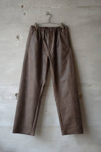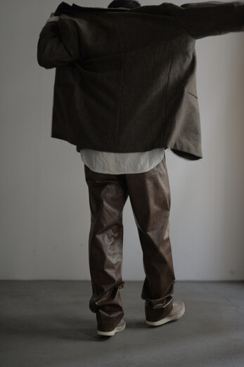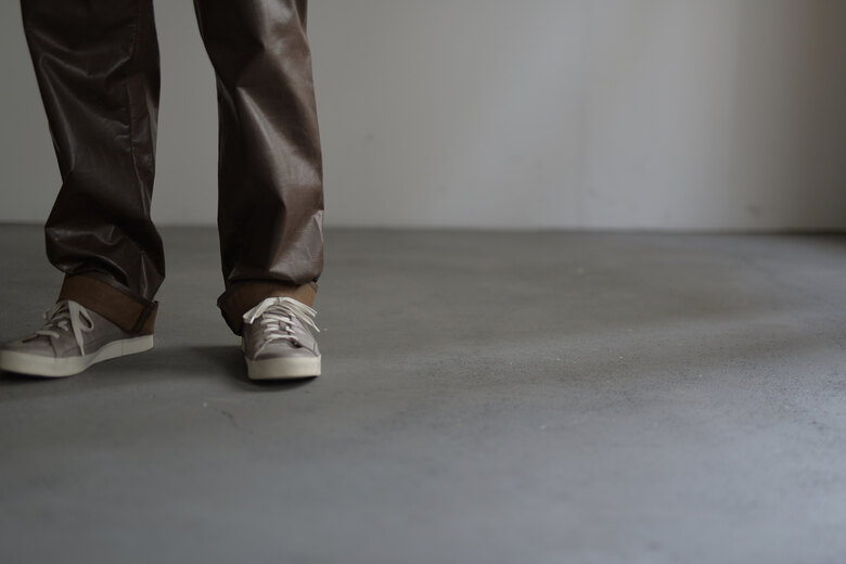 レザーのパンツには興味があったけど、中々手を出せないでいた。なぜかと言うと、足にフィットする物が多い事と気軽に洗う事が出来ない事がネックだった。そんな中、数年前にCLASSが初めて洋服にウルトラスエードという人工皮革を使った。透湿性に優れて丈夫、そして気軽に洗濯が出来た。さらにデザインも良くてリラックスしたシルエット。自分の中ではこれはもう革命でした。仕事の日も休みの日もよく穿いていて、もう手放せないでしょう。今回のMUKUは表面が銀面のコーティングされていて、さらにクロコダイルの型押しが施されている。でもギラギラしていない、良く見るとわかる程度の型押し。そのバランスが凄く気に入りました。ストンと落ちるストレートなシルエットでウエストはゴムとドローコード仕様。程良くリラックスできるパンツだ。裾を折り返せばスエード面が見え、素材感の差異を視覚的にも楽しめる。レザーパンツに見えてレザーパンツじゃない。家でも外でも場所を選ばず、気楽に穿ける。気楽なのに気分が上がる。それがCLASSです。
