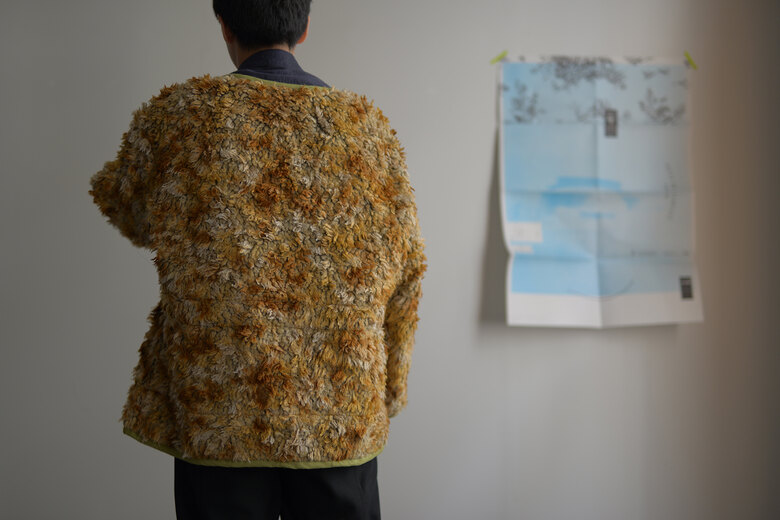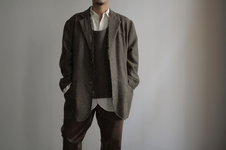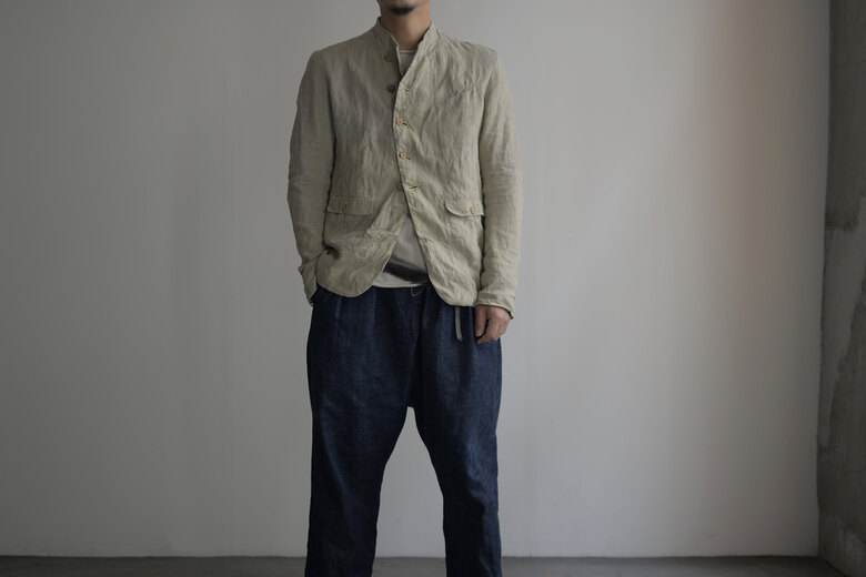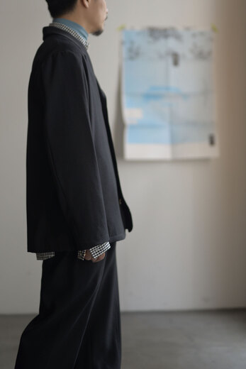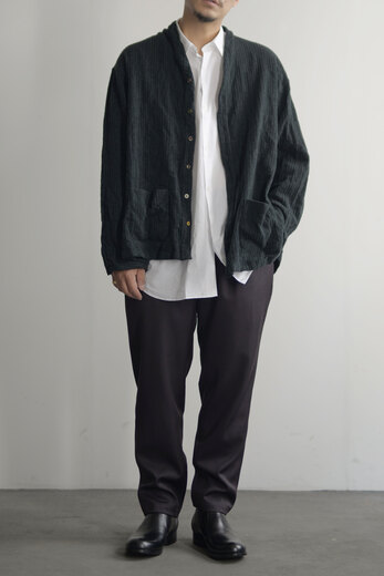 先に紹介したパンツと、同じ生地のジャケット。(生地についてはパンツの記事をご覧ください)こちらは、カーディガンの様にラフに羽織れるジャケットです。カーディガンの作りの様なジャケットという方が正しいのかな?色々と考えすぎると頭の思考が絡まる時がある。その時に深呼吸して頭の中を無にしたら良いと聞いたことがある。でもどこかしらで、あ、冷蔵庫の中の牛乳、賞味期限大丈夫かな?なんて事が頭の中にやってくる。”無”だ、”無”だと再び深呼吸。数秒すると、あ、段ボール捨てなきゃ。とか。頭の中は本当に色々と日常に支配されている。ふと、いや、それで良いのではないか?と思った。カーディガン?ジャケット?何と合わせる?丈はどうだろうか?似合うかな?映画を見に行く時に着る?今度の打ち合わせの時に着る?こんなイメージで着たいなーって。そんな事考えるのが楽しかったりするわけで。それは、自分ごとで。自分が着たい様にあれこれ考えて。このジャケットを自宅に持ち帰った後、そんな楽しみを久々に味わって見るのは良いのではないでしょうか?
