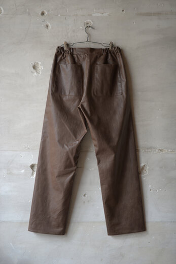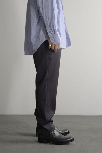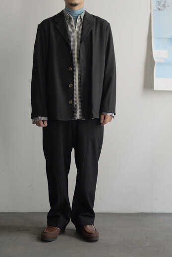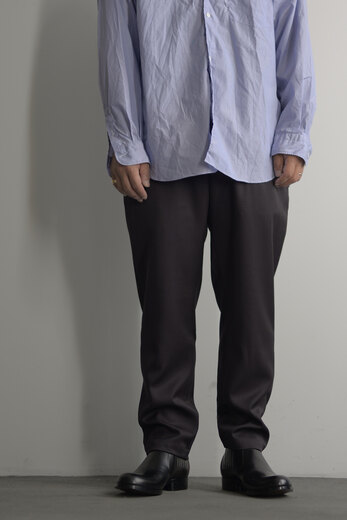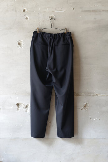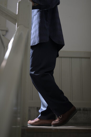 穿いている本人はまるでスウェットパンツの気分ながら、周りからはそんな風には見えていない。このパンツも中間を狙ったデザインだそう。どちらでもない、という事はどちらでもあるという事。あらゆる場面や様々な洋服とマッチする、絶妙なパンツなのかもしれない。素材はワンタックトラウザーズと同じユニフォームギャバジン、程良くワイドなストレートなのでよりドレープが効いている。ウエストはゴムとドローコード(リボン)、お尻には玉縁ポケットが付いている。見た目と穿き心地の違いが面白いパンツ。あまりに楽なので、つい手を伸ばしてしまうでしょう。