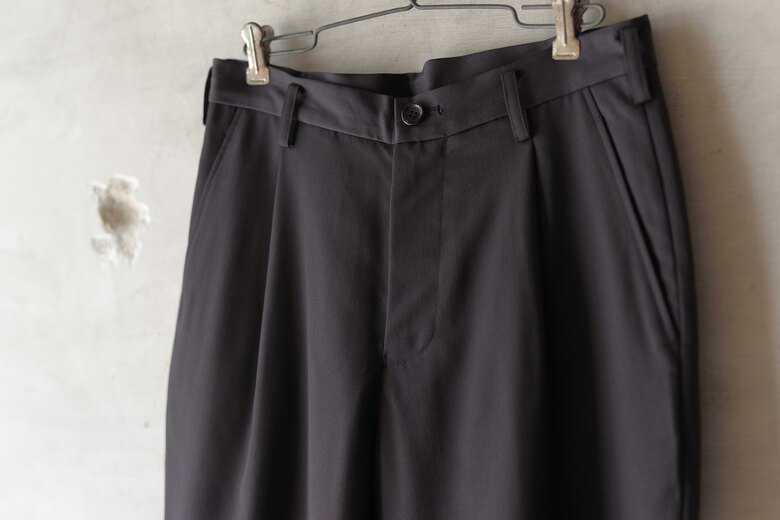 たまに綺麗に見えるパンツを穿きたくなる時はないでしょうか。スラックスまでじゃなくてもう少し気軽に見えて、シャツやジャケットやコートとのバランスも良い気がしていて。ワンタックトラウザーはチノパンよりのデザインで、ユニフォームギャバジンという少し光沢があってハリのある素材を使っている。その組み合わせが丁度良いと感じて今回は選ぶ事にしました。とてもしっかりとした生地だけど、実際に穿いてみると落ち感があって柔らかく見える不思議な生地だ。テーパードしている事もあって、いつもより足が綺麗に見える気がした。アンが作るこのパンツはそんな隙間の欲求に応えてくれる。