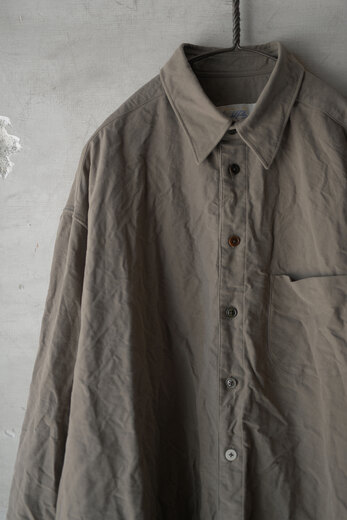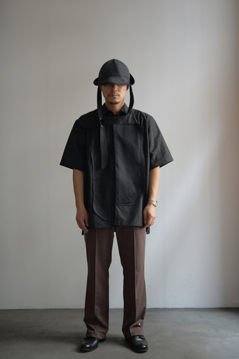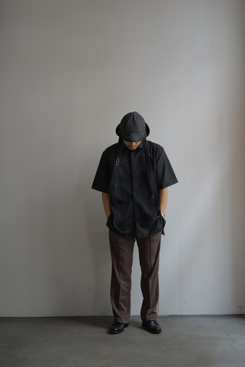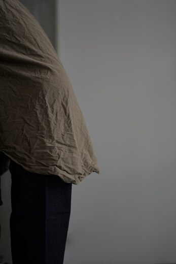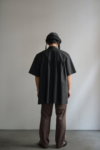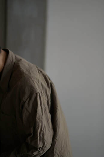 縁が合って堀尾さんというアーティストを知る。多くの作品の中で印象に残っているのが、色が何重も重なる作品と墨で一本潔く真っ直ぐに力強く描かれた作品があった。物事を頭や心で考えているだけではなく、それを形に起こす作業を垣間見た。今季のコンセプトを存分に感じられるデザインの半袖シャツ。前見頃に何重か重なった生地が配置されシルエットが面白く映る。さらに後ろにはたくさんのギャザーがあり空気を孕む。そのシルエットがユニークで唯一無二と言えるだろう。ご試着されたお客様が『前から見るのと後ろから見るのとでは正反対って言って良いくらいに印象が違う。』とそのユニークさを気に入ってくださった。色々あった2020年。だから出来たシャツな気もしました。どうだろう….