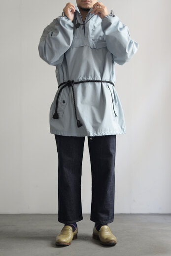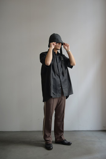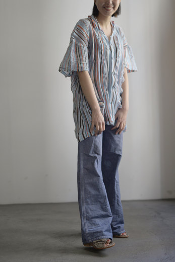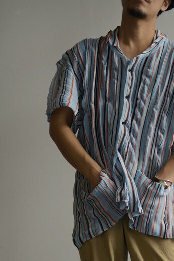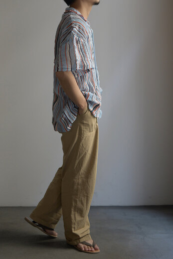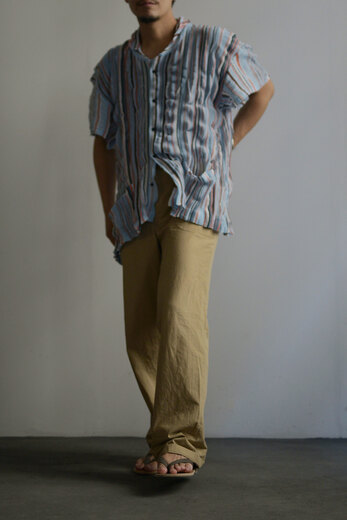 今回のテーマは”a comfy heal-th”デザイナー自身家にいる事が多くなり、自分の身体と心に向き合う時間が増えたらしく今まで関心の無かった植物や花に興味が出てきて一緒に生活をする事で妙な安心感があったそう。そういう時間を過ごして心地の良い、穏やかで、治癒の様な、健康的な何かを求めてる事に気付き、生活の中で洋服に関する煩わしさを軽減したり、着る人にとっても地球にとっても心地の良いものを・・そんな視点から出来たのが今回のコレクション。真夏にさらっと着れる半袖シャツを作りたくデザインを始めたそうで、部屋でも外でも着れてゆったりとしたデザイン、シワ加工が施されているのでシワも気にならない。くつろいでいる時も、ちょっと出掛ける時もそのまま着て行ける。このシャツは自分の時間を最大限楽しむ事ができる洋服ではないだろうか。シャリっとした生地は涼しげで、体との間の空間に風が通り抜けるので真夏に最適な半袖シャツである。綺麗な配色のストライプも気分が良い。ズルッと履いたパンツにサンダル。今年も夏を楽しもう。