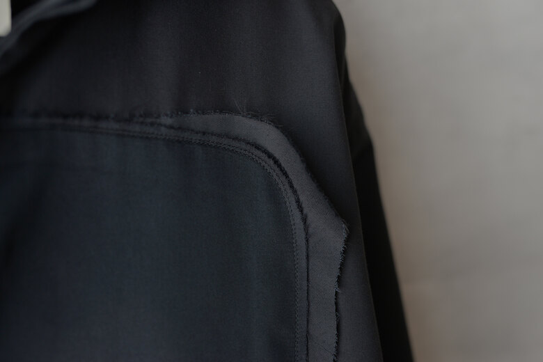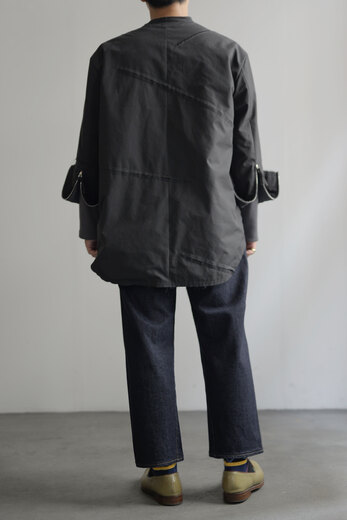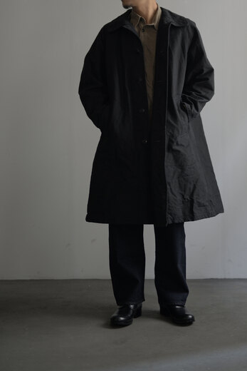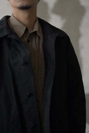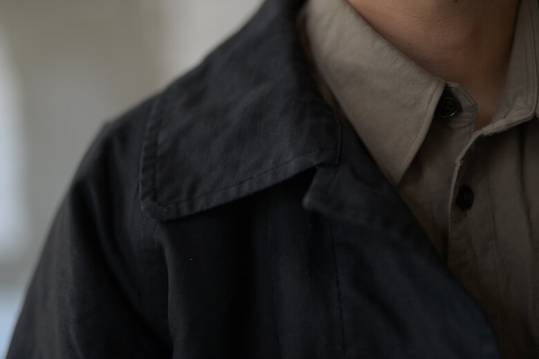 洋服を販売する側にいると、欲しいと思っていても手に入れる事が出来ない場合が多い。勿論提案する事がお仕事なので当たり前なのだが、数年経っても頭の片隅に残っている洋服がいくつかある。その1つがこのコートである。展示会で見た時は触れる前にあの生地だとすぐわかり思わずニヤけてしまった。とても重く固いが羽織ると軽くて着心地が良い。数年着込んだコートをお客様に見せてもらったが、クッタリ柔らかくなり凄く雰囲気が出ていた。The crooked Tailorのコートは着ることによって育つ、長く着たいと思える洋服である。