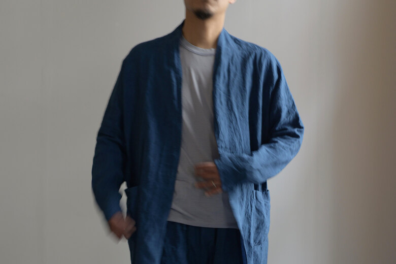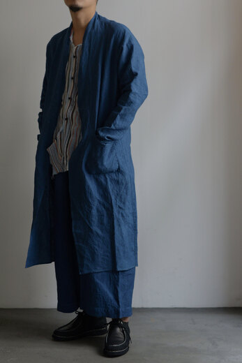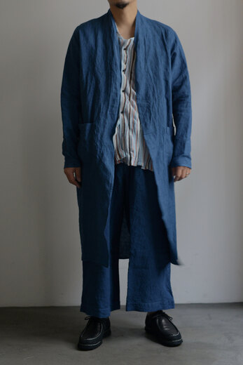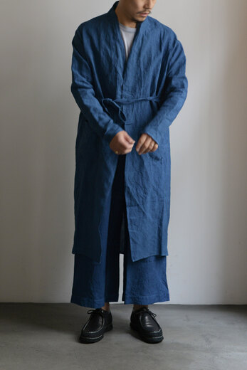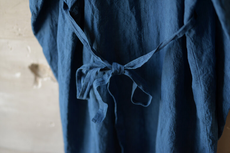 着る人によって、着る回数によって、または洗濯の回数によって、決して同じ物にはならない染物の経年変化。特にインディゴで染めたものはより変化を楽しむ事ができる。すべての工程を自分たちで行うPROJECT by HのAURELIAは織りでストライプを表現したリネンを縫製後、手作業にてインディゴ染めを施している。着丈は少し長く、肩周りはフィットする感じ。でもキツい訳ではなく見た目以上に動き易い。ローブというデザインの特性上、屋内外どちらのシチュエーションも似合いそう。生地自体は透ける程薄いが、しっかりしていて使っていく内に良い方向へ変わっていくのも楽しみの1つ。風を孕むローブは涼しげで着ていて気分が良い。日本人には親しみ深いインディゴ。どんな色に見えるだろうか。