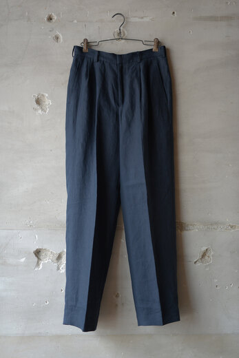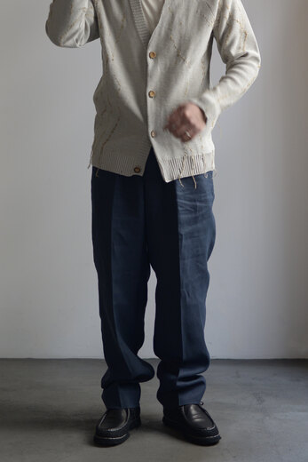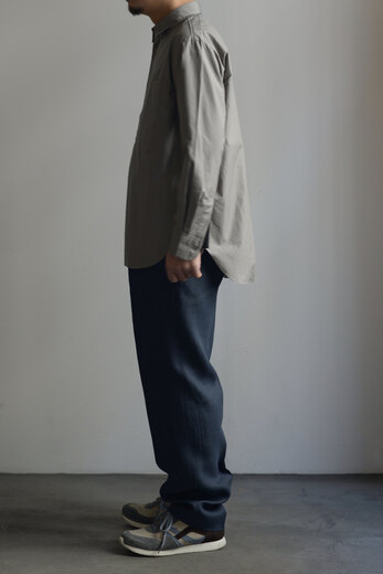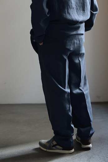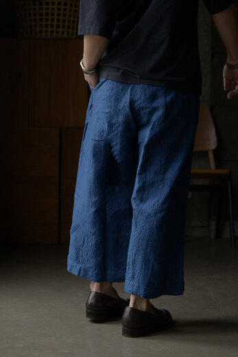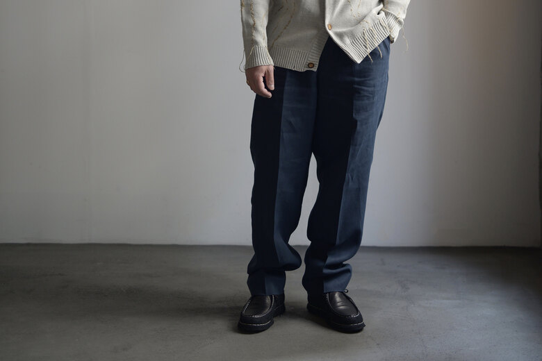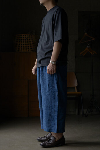 朝、いつものパンツを何本か穿いてみるとしっくりこない。代わりに綺麗なスラックスを穿いてみるもしっくりこない。そんな日が2-3日に1回はあって、決まってseya.のパンツに手が伸びる。涼しげなヘンプ100%、あまり触った事のない独特な触感に惹かれた。ヘンプは通常ガシッとした表情だがこの素材はシルキーというかヌメッとしているというか・・ヘンプと聞いていなければ質の良いリネンだと思ってしまうだろう。太過ぎず、細くは無い絶妙なシルエットで生地の落ち感もありとても上品だ。色名はINDIGO BLUEだがインディゴで染めている訳ではない。しかし奥の方にインディゴが感じられる深い色合いでとても美しい。実際に穿いてみるとキッチリした中に抜け感があってとても穿き心地が良い。一見キレイなパンツだがスニーカーやサンダルも似合う。まさに大人が穿けるラフなパンツだ。だからしっくりこない日にはseya.のパンツをよく穿いている。