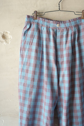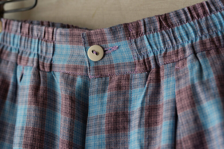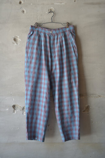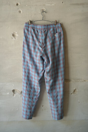 パジャマのようでパジャマではない。そんなリラックス感のあるパンツはここ数年使う事が増えている。自宅でくつろいでいる時やちょっと出かける時にはTシャツだけ着替えれば良い。単に楽をしたいという訳ではなく、気に入ったパンツを長い時間穿いていたいという思いもあるし、良い気分になれるからでもある。9世紀から15世紀まで存在していた王国、クメール。現在のカンボジアの元となった王国で伝統的に作られていたクロマーという綿布だ。一見普通のチェック柄のプリントの様に見えるが亀の甲羅(turtle scales)と呼ばれる最も繊細な技法の生地。その生地をインドで手織りし縫製まで行っている。目を凝らして見るとその繊細さに目を奪われる。シルエットは少しテーパードしたゆとりのあるイージーパンツ。ハリはあるが、肌当たりがとても優しく涼しい。シンプルな白いシャツと。綺麗なウール天竺のTシャツとサンダル。このパンツだからこそ出せる抜け感がクセになる。