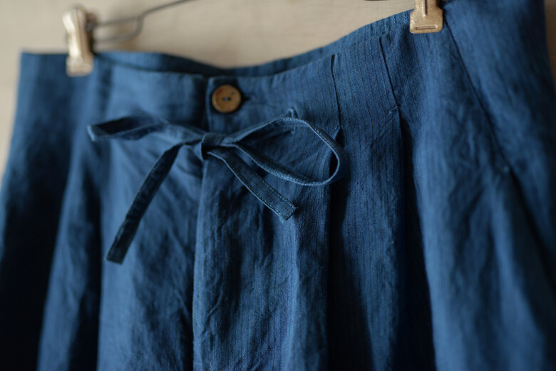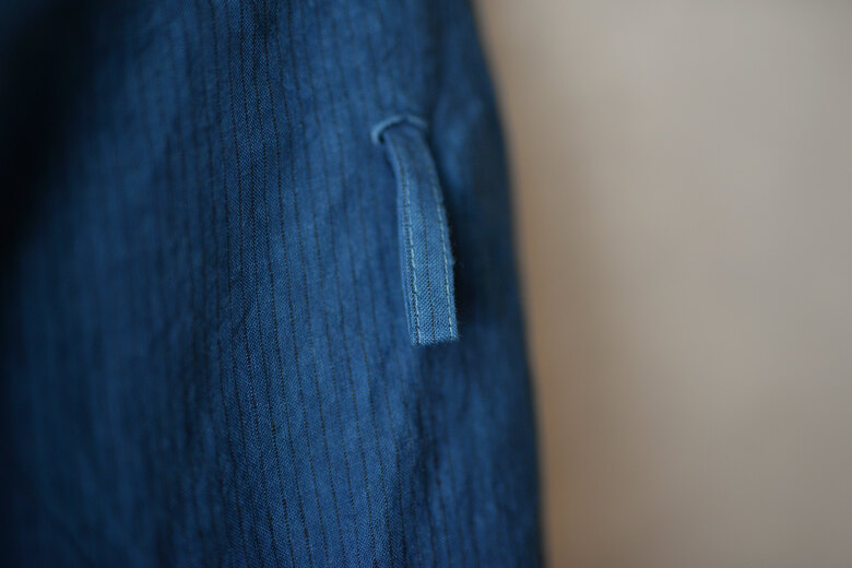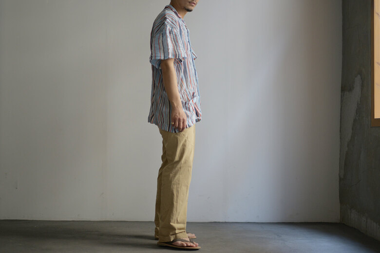 インディゴリネンストライプ。その言葉の響きだけで体が反応してしまう人がいるかもしれない。形は先日ご紹介したパンツと同型。ワイドなシルエットで丈は少し短め。フロントは2タック、共生地の紐を絞れば立体感のあるシルエットになる。石の削り出しボタンはほんのりインディゴに染まっている。穿き初めはハリがあってワイドさが強調されるが、ある程度穿いているとそれが落ち着いてきて柔らかくなる。そして歩いたり、座ったり、擦れる部分は少しずつ薄くなりインディゴ特有の濃淡ができる。夏は一度に着れる洋服が少ない。だからこういった経年変化を楽しむ事が夏を満喫する一つの方法ではないだろうか。