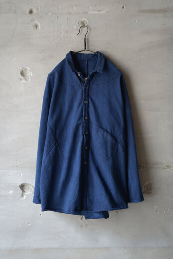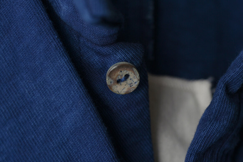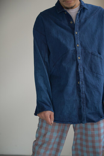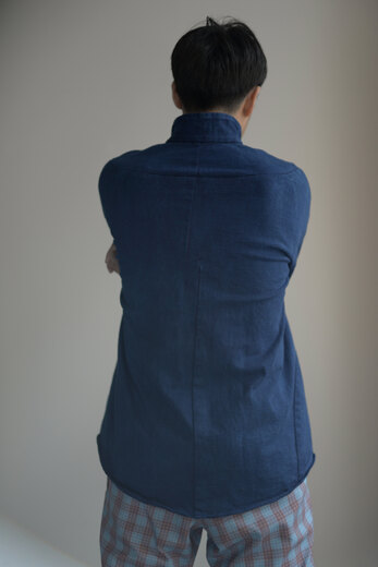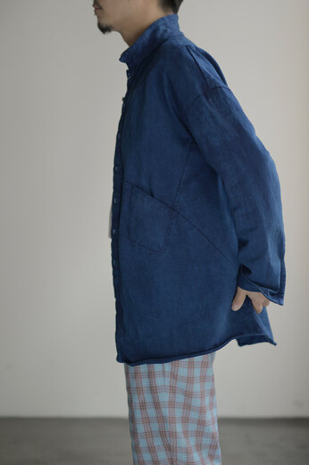 インディゴ染めとは魅力で溢れている。日本でも古くから行われてきた技法が故に知らず知らずの内に馴染みを持っているのか、あるいはリーバイスが作り出したジーンズから馴染みがあるのか。どちらにせよ、着て育てるという所がインディゴ染めの醍醐味の一つである。人それぞれ体格や着る回数や洗濯をする回数、使っている洗剤の成分など、言えばキリがないがそれだけ色の変化が異なってくるという事だ。濃淡がはっきりする場合や全体的に色が抜けていく場合もあって100人いれば100通りの変化が起こる。そのどれもが美しい。PROJECT by HのREVは縫う事自体大変そうなかなり重めの度詰天竺をシャツに仕立ててある。縫製後、手作業でインディゴ染めを施し深くなるまで染める。よく見れば石を削り出したボタンまで少し染まっているのが確認できた。シャツとして作られているが、羽織りとしても良いかもしれない。それだけしっかりしている。実際に着てみると、度詰天竺の伸縮がストレッチのように効いていてとても着易い。アームは少し細身なのでシワが良く入りそう。色落ちによるアタリが期待できそうだ。襟の大きさがコンパクトなので、立てても良い。真夏は暑くて着れそうにないが、それ以外の季節はいつでも着れる。つまり1年の4分の3は着込めるという事だ。