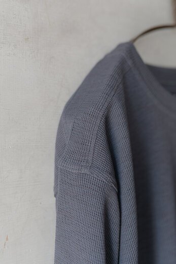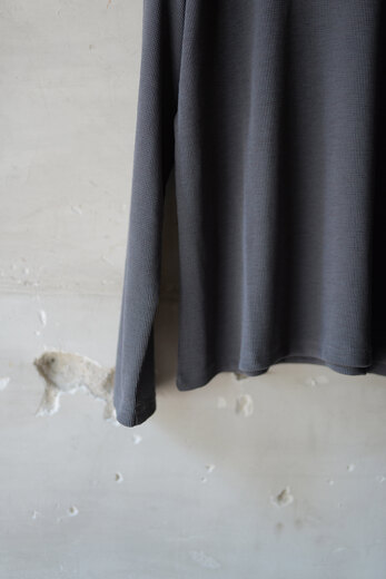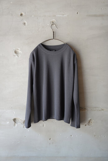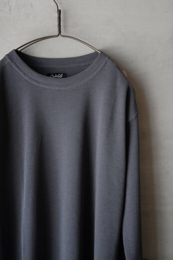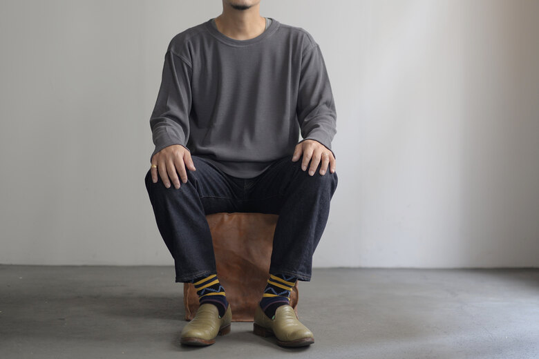 シンプルな物ほど難しいと思う事がある。表情が欲しいと思う時もある。カットソーは体のラインが目立ち易い物が多く1枚で着るほど自慢できる体でもない。とりあえずカモフラージュしたいと思う事が多い。このINDIA TURNIPは着心地が良く、気を遣わず着る事ができて、凹凸があり程良く広い身幅でドレープが効いている。何でも合うなんて乱暴な言い方はしたくないし、まだ試着しかしていないけど、きっと着倒してしまうのだろうと予想出来るカットソーである。下に合わせるパンツやシューズ、上に羽織るジャケットやカーディガン。このINDIA TURNIPから今季入荷する他の洋服へと容易に想像ができる、という具合に初めは合わせるのに重宝しそうなカットソーから、そしてこのカットソーが主となり構築されていく…それがCLASSなのだ。