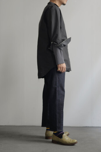 どっストレートなデニムというのは中々ありそうでない。それに絶妙に寸足らずで、穿く人や合わせるシューズにより雰囲気が変化する。一見何でも無いようで個性のあるデニムである。今までも楽しいデニムをCLASSでは見てきたし、穿いている。子供用のパターンをそのまま大人用に大きくしたデニムや、その当時にしたら嘘だーって思うくらいの裾広がりだったり。それらは数年が経ち時代も変わっているのだけど、今でもそれらは現役で仕舞い込むことはない。衣替えの季節が来てもクローゼットの中に常に存在している。要するに、なんだかんだとCLASSのデニムが好きなのだ。今回のデニムは冬にブーツと合わせたいと思っている。数年後には何と合わせたくなるのだろうか….このデニムもいつかのCLASSということでご紹介したいと思っているのだけど。買えそうにない….。