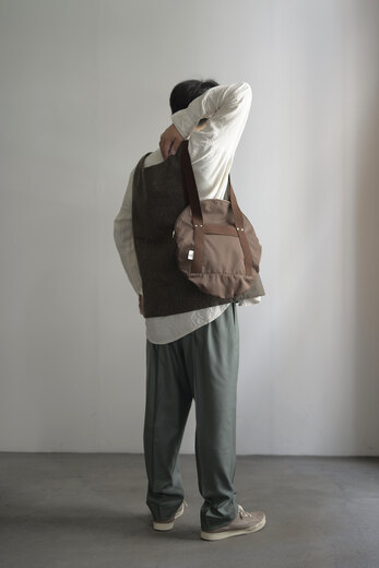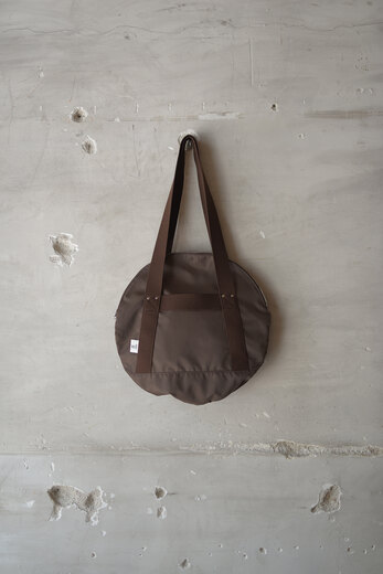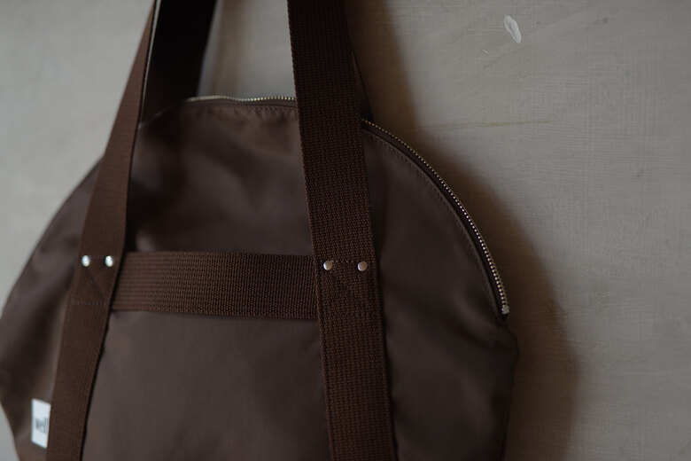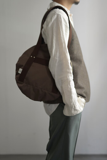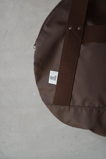 冬の事を想像する。デニムを穿いて、暖かなニットを着る。少し丈の長いコートを羽織ってマフラーを巻く。それぞれ素材感があって、鞄は少しラフな物を使ってみても良いかもと考えていた時にwellの鞄に出会った。A-BAGの2作目である丸いフォルムが可愛らしい鞄。肩に掛けるのに丁度良い長さの持ち手。外にも中にも潔くポケットは無く、荷物はそのまま入れる。何ともシンプルな鞄である。ナイロンなので水にも強いし、軽い。小さく丸める事も出来るのでエコバッグ的な使い方も出来そうだ。