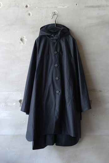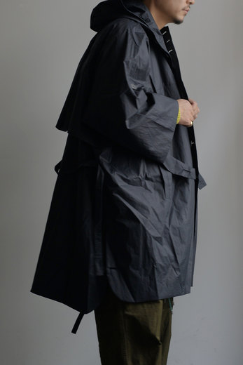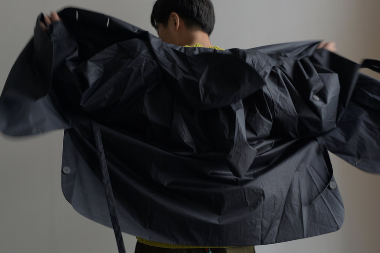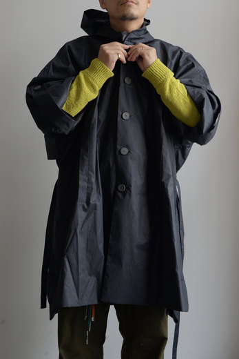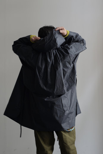 今年はもう梅雨入りをしたそうだ。早まった代わりに開けるのが早いのか、ただ長く続くのか。ジメジメするのは苦手だが雨自体はネガティブに思わない。雨をボーッと見ている事や音を聞くのも好きだ。雨の日の休みに1日家に籠るのも悪くない。でも仕事や用事で出掛ける時に雨、そんな日をどうせなら最大限に楽しむ術を考えても良いと思う。例えば雨に濡れても大丈夫なめちゃくちゃ格好良い靴を履いたり気に入っている傘を使う事。そんな些細な事でも雨の日を少しは楽しいと思えるのではないだろうか。オマールのこのコートは今が丁度良い。多少の雨なら大丈夫そうだし、暑かったら袖を折りボタンで留めて短くすれば良い。小さく畳めるので鞄にも入れられる。そして何より格好良く、気分が上がる。高密度に織られたコットンにコーティングを施しパリッとしたナイロンのようでドライタッチな質感の生地。コーティングによって重みが増し、ゆったりとした、ふっくらしたシルエットにより美しいドレープが楽しめる。すでに完成されたトレンチという物体を最大限に崩した、新しく、雑な言い方になるけれども、今っぽさが感じられファルムと生地がとても良いバランスでマッチしている、そんな印象を感じた。