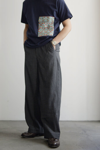 大胆不敵(NAIDAR)、大胆で何事も恐れないこと(さま)。あれこれ考えてしまうと結局何もできない事が多い様な気がしていて考えるよりも先に体が動いてしまう、それが本当にやるべき事だと思っている。PROJECT by Hのデザイナーは自由な発想で自分が作りたい物を最大限に、挑戦的に表現していると感じている。麻の一種のラミーとコットンの混紡生地で墨で手染めしている。所々ムラがありそれが何とも言えない表情だ。かなりワイドなシルエットで丈は短め。2タックでウエストを絞れば立体的になる。大胆なパターンも見所。石の削り出しボタンも大好きな雰囲気。穿き初めはハリが強くワイドさが強調されるが、ある程度穿いているとそれが落ち着いてきて柔らかくなる。使えば使うほど良くなる。だから使いたくなる。そんなパンツだ。