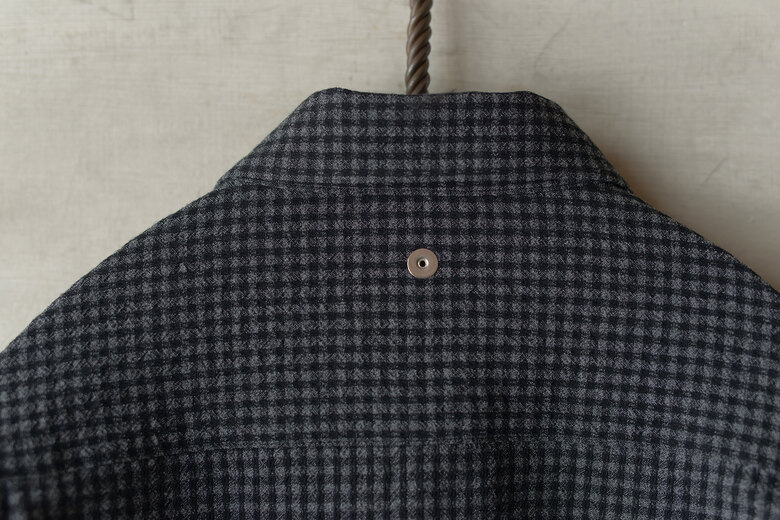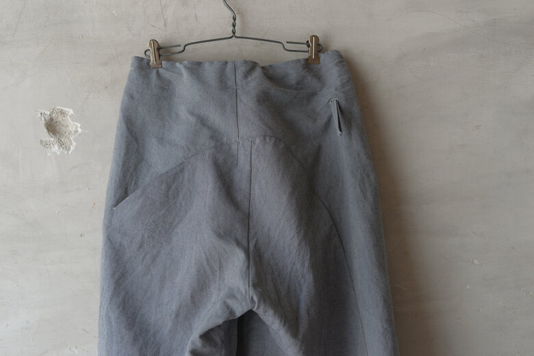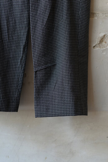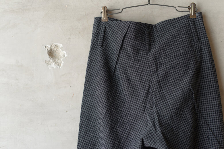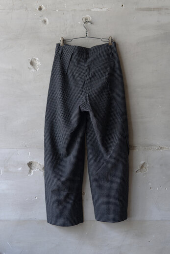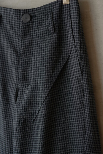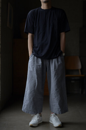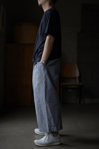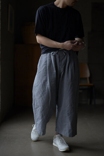 私は足が太い。お店でそんな話をしていると大抵『何かスポーツをしていたのですか?』と聞かれる。特に足が太くなる様なスポーツをした事がなく、やっていたのはバスケ位でどちらかと言うと周りはスラッとしていた。幼少期の写真を見るとその頃から太かったので、きっと生まれつきだ。今はそんな風に思わないが、少しコンプレックスに感じる時期がありワイドパンツを穿くようになった。軍パンから始まり、ワイドパンツの格好良さにハマっていった。ワイドなパンツほどパターンが重要で足とパンツの間に出来る空間、そこもデザインされていると思えるパンツが良い。オマールのこのパンツは絶妙。ツイストしたデザインでゆとりはあるけどスッキリも見える。そして軽やかで穿き心地が良くとても気に入った。シャリ感のある凹凸のあるウール。実際に歩いてみると風が通り抜けて涼しかった。革靴が良く似合う、真夏にはダルッと穿いてサンダル(PETROSOLAUMから近日入荷)も良さそうな気がする。