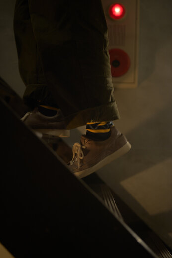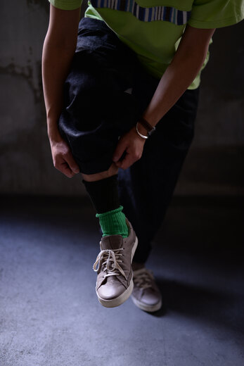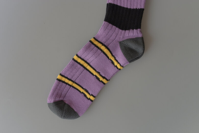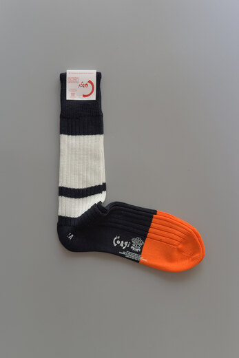 革靴やスニーカーだと黄色が見えない。見えないからこそ良いとも考えられる。しかし単調なストライプではないので見せたい気もする。きっとサンダルにも似合う、そう思った。例えばビルケンでも良いし、そのみつから入荷する予定のゴム底のサンダルでも良さそうだ。素材はソフトコットン。柔らかく締め付けも少ない。使い込むとダルッとした雰囲気になる。それがまた堪らなく気に入っている。CLASSのデザイナーがCorgi社に別注して作ったソックスなのでインラインには無いカラーやパターンが魅力。