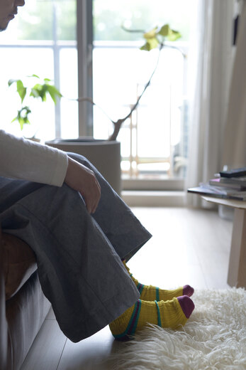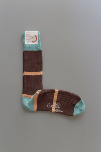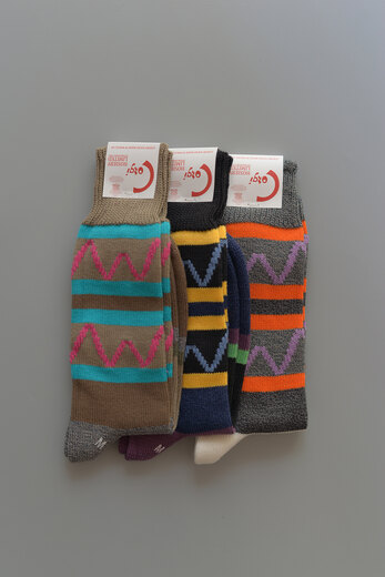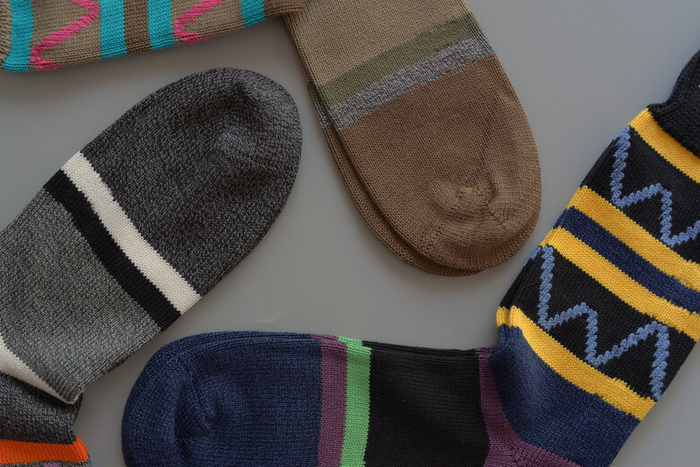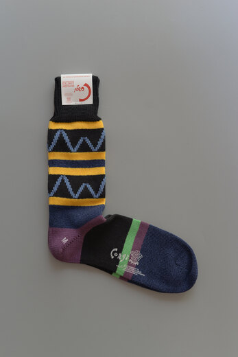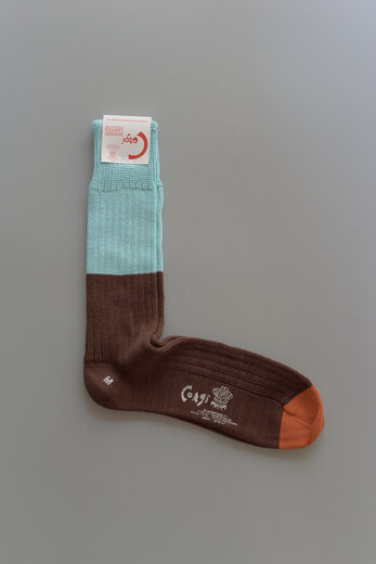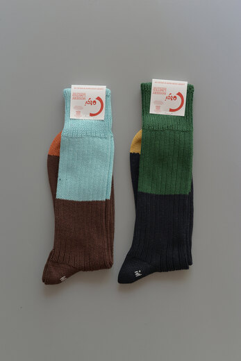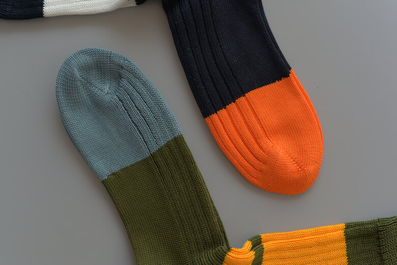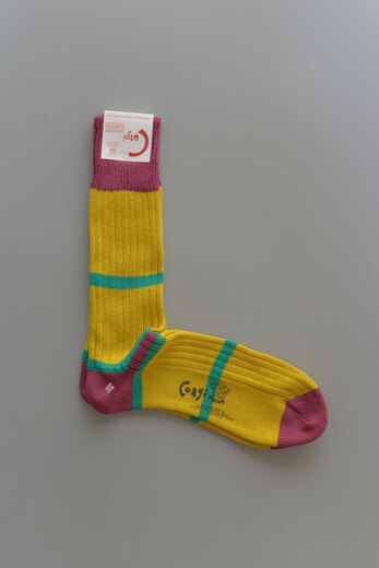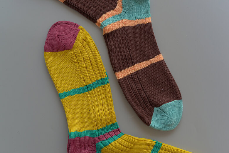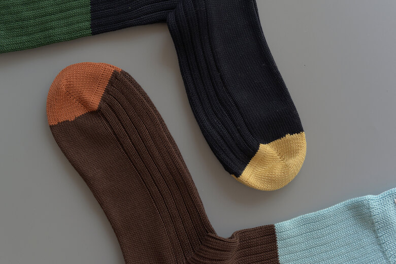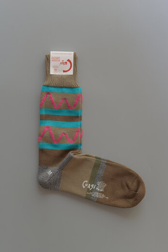 オシャレは足元からとよく言うが、どんなに良い洋服や靴を履いても靴下が残念な日は気分が上がらない。ほとんど見えない部分ではあるが、結構重要な役割が靴下にはあると思っている。マスタードカラーをベースにプラムの様な色とグリーンの配色、ブラウンベースに淡いブルーとサクラ色の配色。どちらも季節を問わず合わせられそう。素材はマーセライズドコットン。少しシャリっとした触感で、耐久性もある。CLASSのデザイナーがCorgi社に別注して作ったソックスなのでインラインには無いカラーやパターンが魅力。