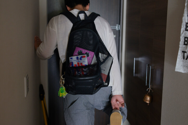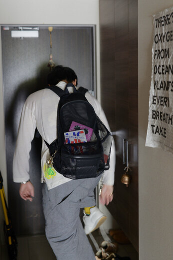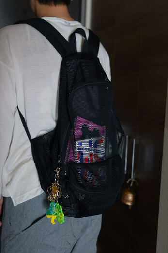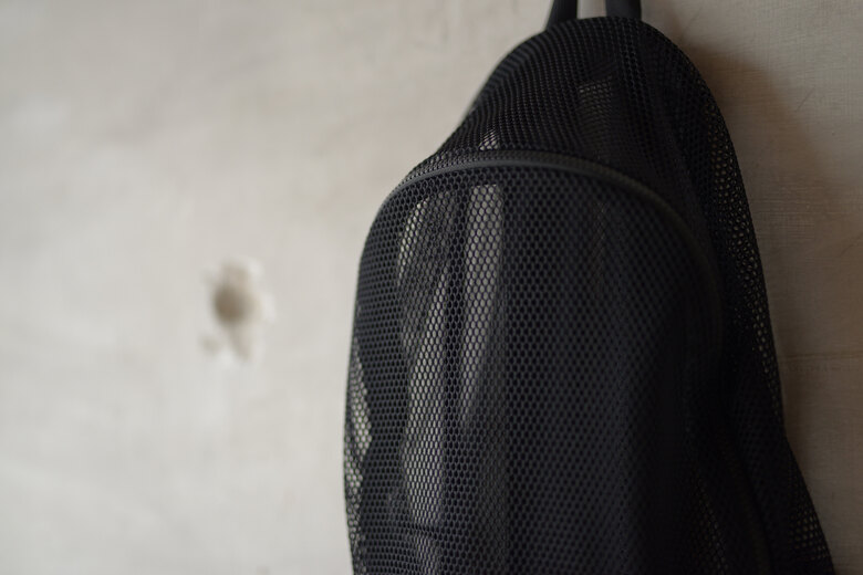 このバッグを弊店では「SNSバッグ」って呼んでいる。お正月過ぎた頃に次回入荷するアイテムを画像でお客様に見てもらっていた。このCOMOLIのディパックを見て皆「中身丸見えじゃ無いですか?!」って言った。だから、SNSバッグって名付けた。SNSって日常の出来事をどんどん投稿する。例えば、弊店と同じ丼池筋にあるtoibooksさん(私たちが大好きでリスペクトする本屋さんで以前”思考の外側”という企画を一緒に作っていただいた。)で本を買った。その本をこのバッグに無造作に放り込んだ。行きも帰りもこの本はとりあえず読み終わるまではこのバッグの中にある。前にPOLさんとi see allさんで買ったお気に入りのキーホルダーを付けてみた。お客様がそれを見て、この手のバッグにはこういうのが映えますよね?って言った。ほら、やっぱりSNSバッグだって言って笑った。そうそう、SNSには鍵アカってのがある。見えたくない場合は、何か袋の中に入れてバッグに入れればよい。YINDIGO AMのカットソーなんかを買うと付いてくる布の袋がある。そこに入れる。さあ、どんどん日常をこのバッグに入れてください。