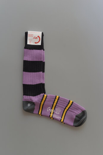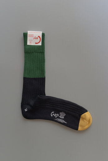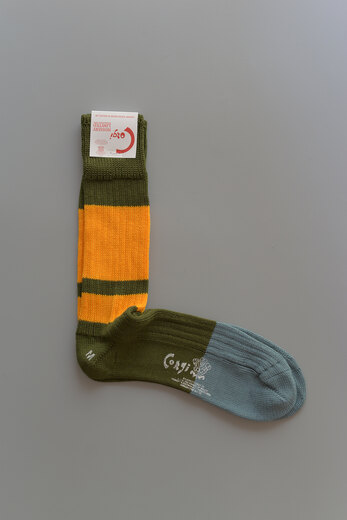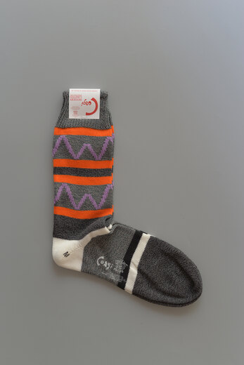アウトドア用という訳ではないが、ある程度使い古したものはキャンプにも使う。(片方だけ無くした靴下をたがい違いに履いたり)アウトドア用のソックスは機能性があってとても使いやすいが、好みの良い柄や色の物があまり無い。キャンプに着ていく物まで拘ってはいないが、気に入った物を使いたいと思っている。素材はマーセライズドコットン。少しシャリっとした触感で、耐久性もある。CLASSのデザイナーがCorgi社に別注して作ったソックスなのでインラインには無いカラーやパターンが魅力。