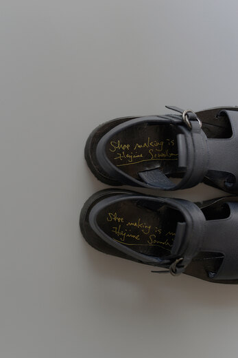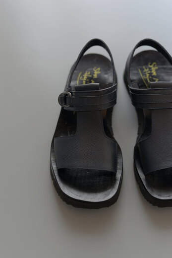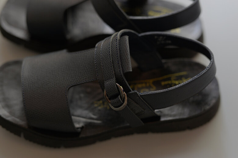 どこまでも歩けそうで、歩きたくなる靴。そのみつは手作りの温かみを感じる事が出来て、革靴の本当の履き心地はこうだ!と私に教えてくれた革靴を好きになるきっかけになったブランドだ。日本人特有の足型の救世主と呼べるかもしれない。素材はフランス、アルザス地方で作られたユタカーフ。ロシアンカーフを再現した、菱形の型押しが特徴的な革。型押しだと硬いイメージがあるがオイルがたっぷりなのでとてもしなやか。アウトソールはビブラムのライト。重量が半分位で丁度関節の部分に切り込みが入っているので、ゴム底なのに反り返りが良い。踵部分も固定しているので走り出せそうだ。ダブルリングのストラップを少し緩めるだけで着脱が出来てストレスもない。包み込む革靴とは違いサンダルであの高揚感や履き心地を出すのは難しい様に思う。しかしそのみつがサンダルを作ればそのみつになる。つまり革靴と同じ気持ちになれる、そんなサンダルだ。