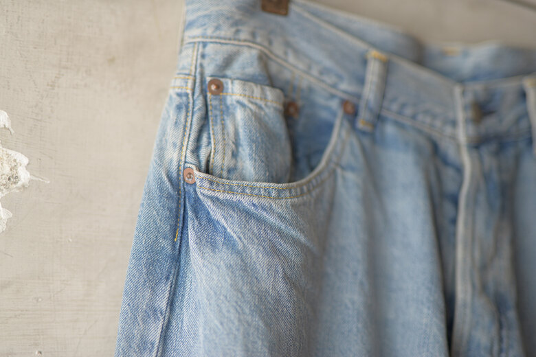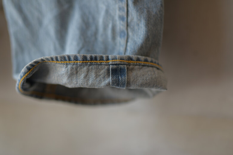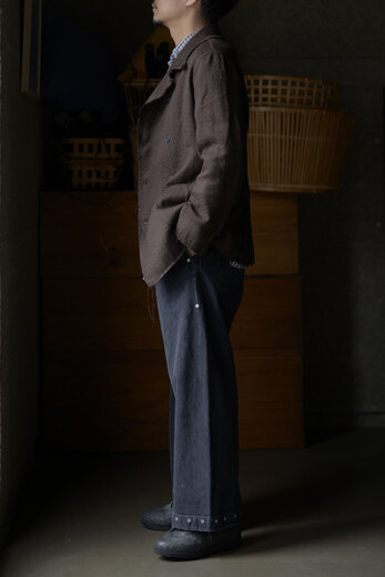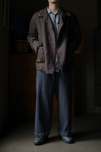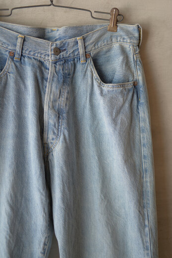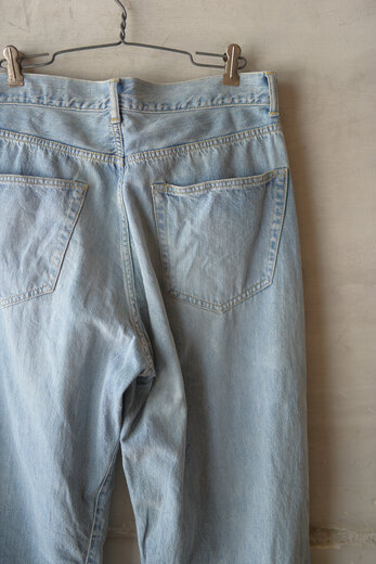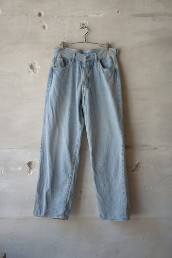 洋服に興味が出て買い始めた頃、もっぱらリーバイスのジーパンばかり買っていた。バレンシア工場製の復刻から始まり少しずつヴィンテージを探す様になった。当時は高校生でアルバイトだけでは中々買えなかったので週末開催されるフリーマーケットに良く顔を出し探していた。そこでヴィンテージのリーバイスばかり持ってきているおじさんに出会った。何度か通う内に顔を覚えられ、『今日はとっておきがあるよ』と出されたのがボロボロのXXだった。ウエストは確か40インチ位で、ベルトを思いっきり締めてもでかい。悩んだが、XXとしては超格安だったので結局買う事にした。色々なジーパンを買って穿き倒したが、結局1番穿いた(好きだった)ジーパンはおじさんから購入したおおよそ40インチのXXだった。ワタリと裾の太さが絶妙でウエストがジャストの物だと細過ぎてしっくりこなかった。COMOLIのジーパンを見ながらその事を思い出し、話を聞くとデザイナーの小森さんも同じ様にXXを穿いていたらしい。だからウエストはある程度ジャストに近い大きさで太さは38インチ位のバランスのデニムを作ったそうだ。ジーパンの理想の形。懐かしくもあり新しい。