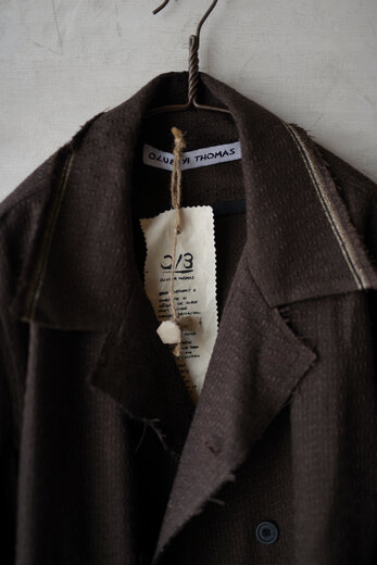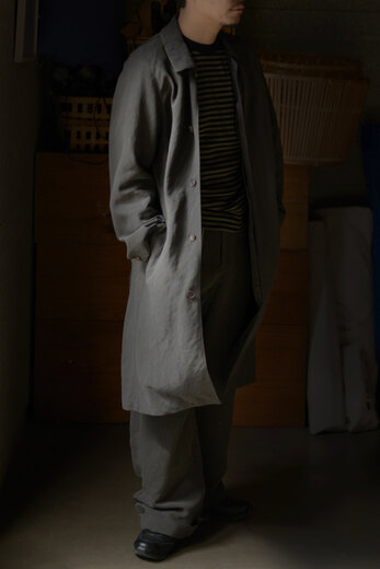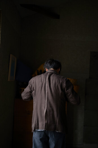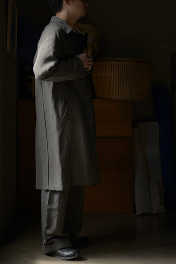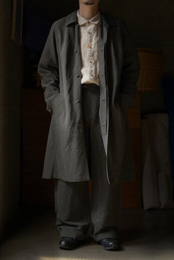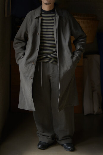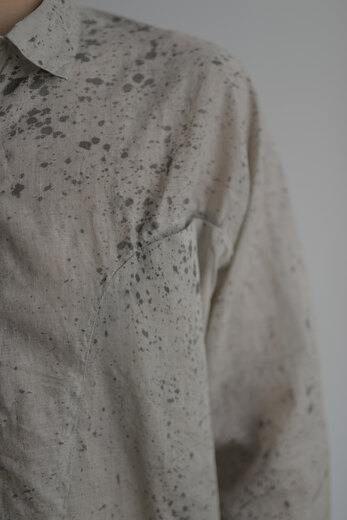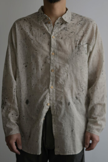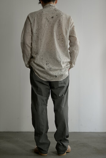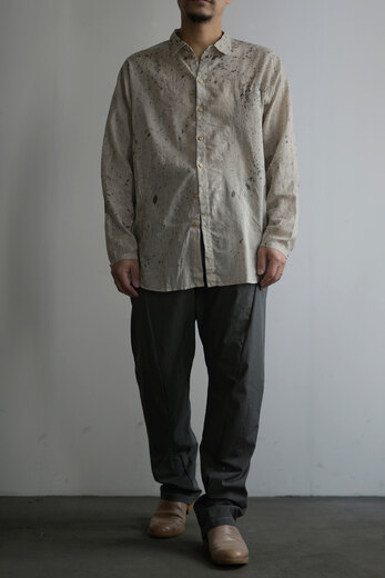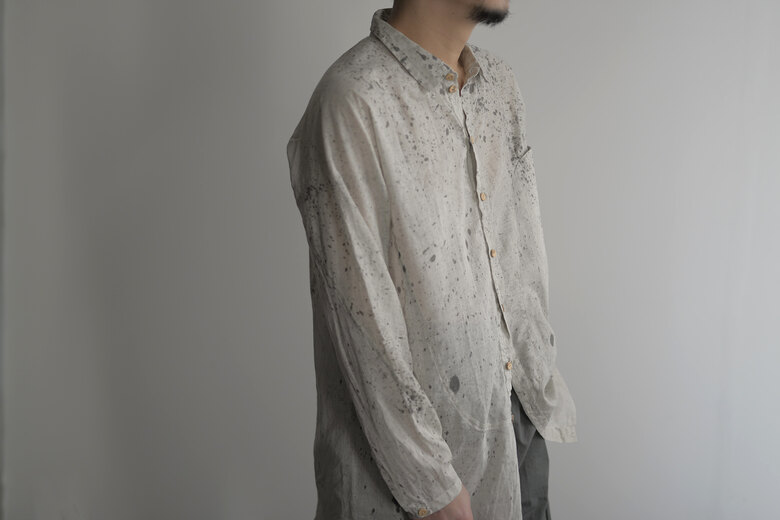 今回のテーマ、カタルシスを象徴するオーバーサイズシャツ。備長炭の粉を水に溶かし、指に付けてそのまま染料を飛ばしてランダムに付けられており、普段目に見えない人の感情を表現している。素材は風が通り抜けるコットンラミーローン。まるでカディコットンの様な涼を感じる気持ちの良い生地で真夏でも快適に着用できそうだ。独特なカーブを描くパターンと作り、芸術的なデザインは唯一無二のシャツと言えるのではないだろうか。