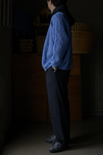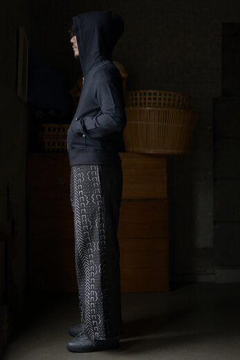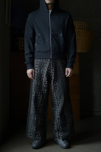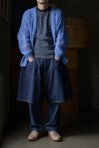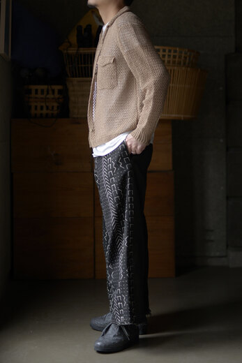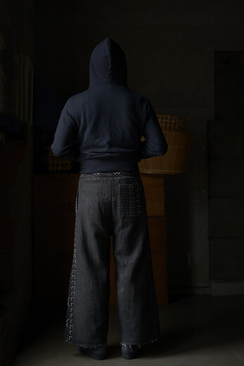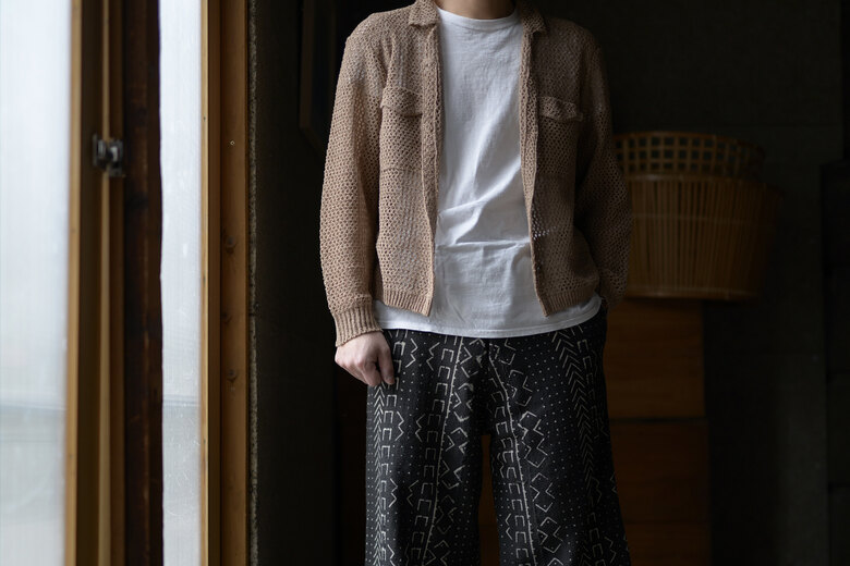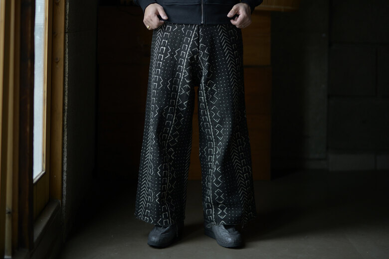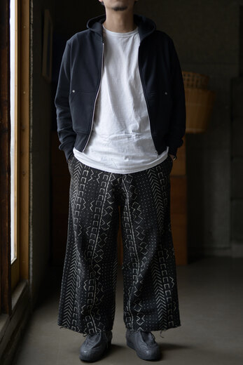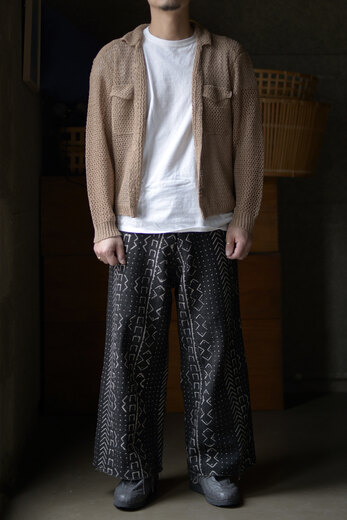 彼のルーツでもある西アフリカの伝統的なヴィンテージファブリックを手作業にて泥染した素材。元々は幅の狭い生地を一つずつ縫い合わせ形にしている。生地や染、そして帯びてきた時間や作った人たちなどが層になって出来上がっているパンツ。他にも色々な語るべき要素があるのだが、このパンツを初めて見た時、白いTシャツにサンダル。クテクテになったカディシャツに。もしくは….あれと合わせたい。あのブランドと合うんじゃないか?それにお客様は私たちの想像しえない合わせをしてくれるんじゃないかな?って想像すると楽しくてドキドキした。手持ちの何かと合わせてほしい。きっと新しい世界が広がるし、ここから洋服の面白さを知るのも素晴らしいと思う。大袈裟ではなく生きててよかったね。って2人で笑った。それに彼らの考えやプロセスもすごく共感できたし素晴らしいものだった。