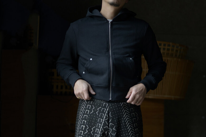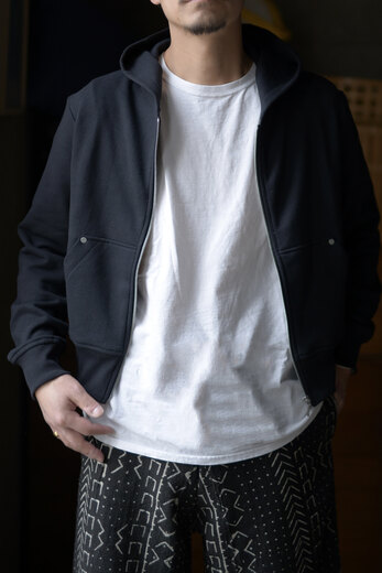 デニムみたいに定番なアイテムというのが世には沢山あるのだが、時々思う。この人が作ったらどんな感じになるんだろう?と。Omar Afridiが作ったZIP HOODIEには程よく緊張感がある。崩す感じに取り入れやすいモノではあるのだが、それとはどこか違う。これを書くために考えてみたけれども、何かと比べるというのがそもそも間違いで、他にはない。持っている何かしらのアイテムと合わせてみると新しく楽しくなるのでやってほしい。冒頭に緊張感という言葉を使ってけれども、それは印象だけで柔らかい生地が心地良くリラックスできる。長時間の移動、例えば飛行機なんかに乗って出かける際にはとても良いのでは?と個人的に思う。それに普段着なアイテムなんだけど、これ、言葉にならないカッコ良いさを感じませんか?
