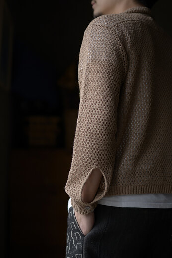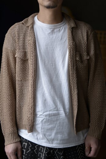 Taiga Takahashiのデザイナーに向けて製作したそうで、良い具合に力が抜けていて、気持ちの良い着心地が気に入りました。普段ならサイズ2だけど1でピッタリ着ても何だか良いなと思ったニットシャツ。素材は和紙とオーガニックコットンとリサイクルポリエステル。優しく丈夫で、隙間からの風が涼しい。カーディガンのように真夏の室内でも重宝しそうだ。中にTシャツ?シャツ?タンクトップ?色の組み合わせも含めて季節を楽しめるShirt for Taiga。