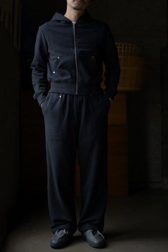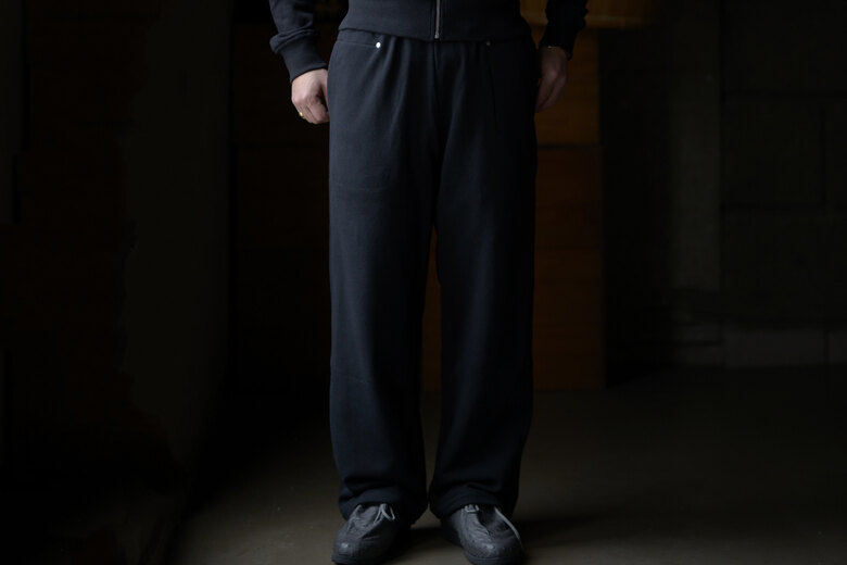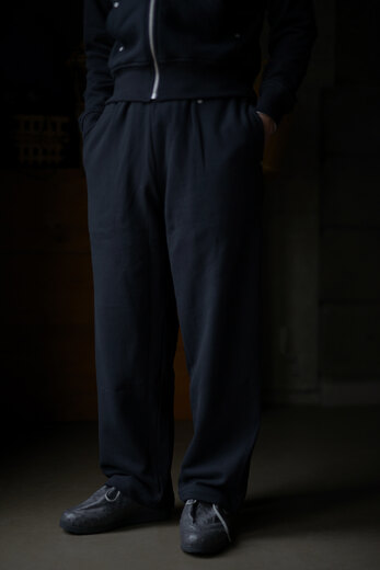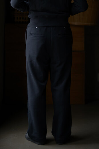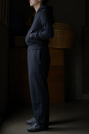 デニムみたいに定番のアイテムというのが世には沢山あるが、時々思う。この人が作ったらどんな感じになるんだろう?と。Omar Afridiが作ったLOUNGE PANTSはやっぱりZIP HOODIE同様に程よく緊張感がある。いわゆるスウェットパンツではあるが、腰回りがすっきりしていてダボっとせず、今までのOmar Afridiのパンツ同様に綺麗なシルエットでトラウザーズの様に合わせる事ができる。けれども名前通り柔らかい生地が心地良くリラックスできる。という訳で、他のアイテムと合わせやすいし合わせるのが楽しい。普段着なアイテムなんだけど、言葉にならないカッコ良さを感じませんか?