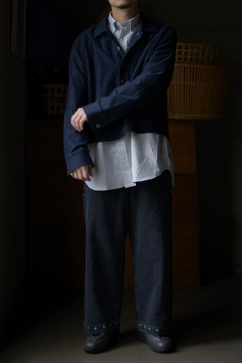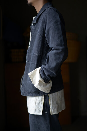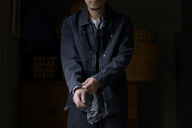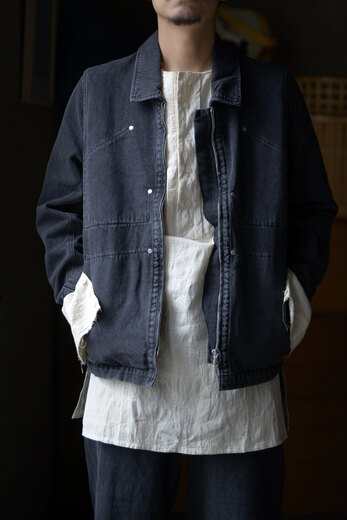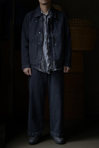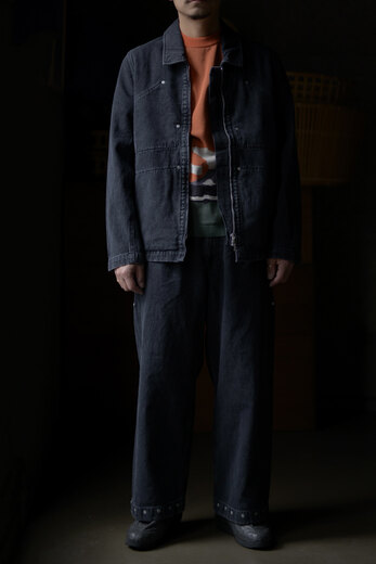 オマールアフリディが作るデニム。それはとても新鮮で、デニムだけどデニムじゃないような・・・そんなカバーオール。ストーンウォッシュを施したブラックデニムは本来の硬さが取れ、程よく柔らかい。だから初めから体に馴染み動き易く快適だ。出かける時にはつい手に取ってしまいそうな気がしている。同素材のパンツとセットアップも違和感がない。打ち込まれたリベットとダブルジップ、スプリットラグランのようなパターン。デザインと機能性のバランスが取れたカバーオール。