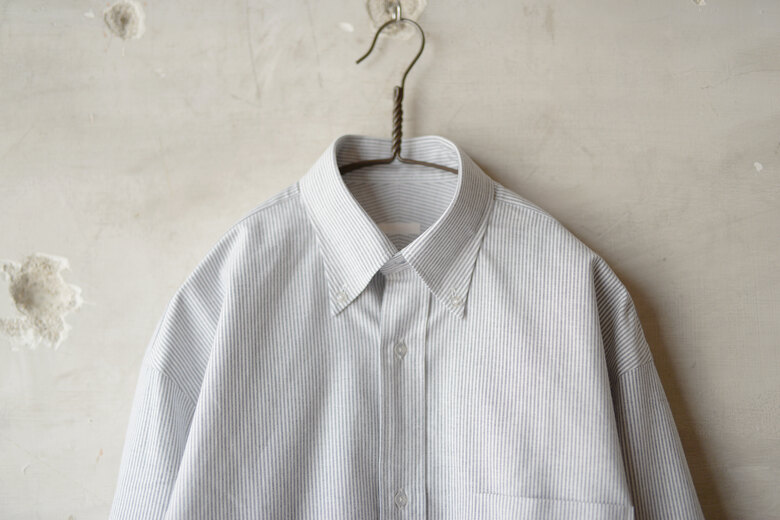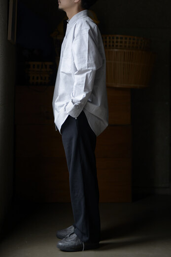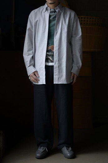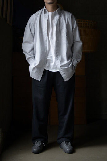 『何だか懐かしい感じですね。』古着が好きなお客様が言われていた。90年代古着の大きなラルフローレンのBDシャツを着ていた事を思い出す。当時はチャンピオンのスウェットパンツやリーバイスのブラックデニムなんかを合わせていて、あとで気付いたがオマールアフリディのブラックデニムとスウェットパンツで写真を撮っていた。その頃の空気感とか好きだったものって変わらないんだなと。コモリのオックスBDは、ただ大きいだけのオーバーサイズではなく程良く感じる。素材のコットンオックスは滑らかで上品な趣きだ。未洗いなので、洗濯して自然乾燥すると2-3cm縮むらしい。そんな所も何だか懐かしい。