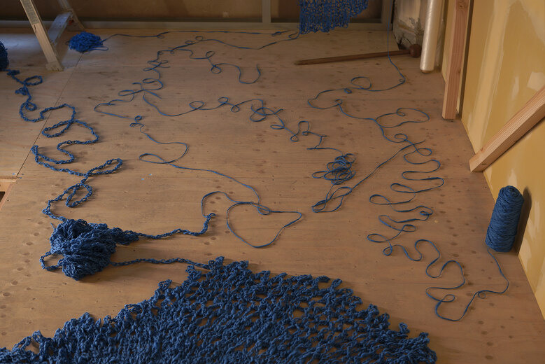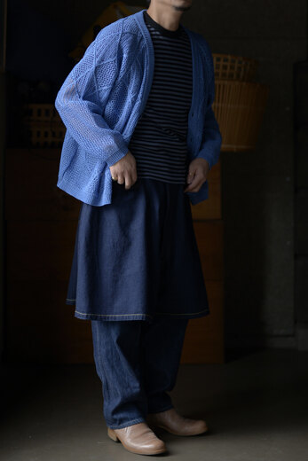 去年の春頃に尾角典子さんとKota Gushikenくんの展覧会を見に京都にお邪魔した。作りかけの部屋に途中なのか、または完成されているのを解いているのか、はたまたその両方なのか、それがぐるぐるつながっている様なインスタレーションだった。もちろん静止しているのにニットから糸が解けてその文字が動いている様を想像して頭の中で止まらなくなったのを覚えている。そして尾角典子さんとのカーディガンを作ったと見せてもらった時もニットと文字が繋がってまた解けてまた繋がってとグルグルと繰り返されているかの様に『ゐゑす』と書かれた文字。身幅は広く夏はまとわりつかず半袖やタンクトップの上に。これからの時期はスウェットなどの上でも着れる。中に着る色や質感によっては『ゐゑす』が浮かび上がるから色々自分のお気に入りを探してください。幾度と書いているけれど、アートというのはそれに触れた時の喜びだったり刺激だったり挑戦だったり、少なくとも人間に何かを与えている。 それだけを取ればアートもファッションも同じだと思う時がある。そんなのを身に纏えるなんて凄い。そしてこれを纏える人が心の底から羨ましい。