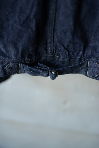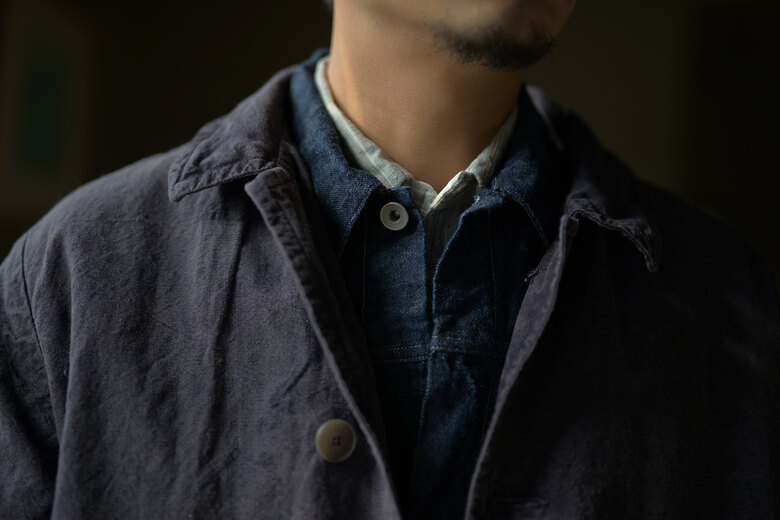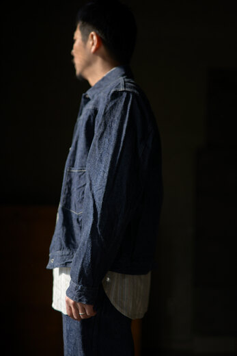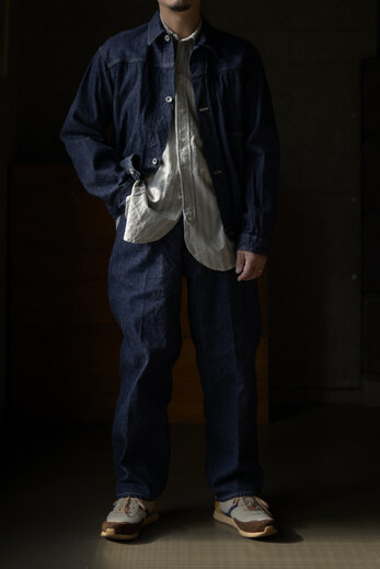 ちょっとそこまで出かける時に羽織る。遊びに出る時にはお気に入りの洋服と組み合わせて羽織る。寒くなってくればコートの下に着てシャツのように使う。様々な場面で羽織れるジャケットを持っていると大変便利である。凹凸のある昔ながらの生機のデニムを使った1STタイプで薄過ぎず、分厚つ過ぎず夏以外羽織れるジャケットだ。少し着丈が長めなのでバランスもとり易い。ベーシックが故にどうやって組合わそうかと考えるのも楽しい。黒と生成りの糸を使い、着込んだ際に昔のリーバイスのブラックデニムの様な色落ちを期待できる素材。数年後、どんな風にフェードしているか楽しみなジャケットだ。