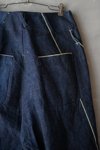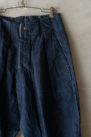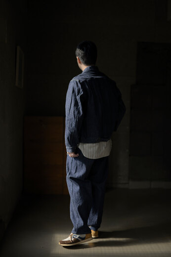 新しいデニム(濃紺)を見ると穿きたくなる。それはやはりインディゴブルーに惹かれるからなのだろうか。デニムパンツといえば大体デザインは決まっていて、そこから抜け出す事ができないでいる。それをいとも簡単に突き抜けて、純粋に洋服を楽しませてくれるのがPROJECTbyH.。春夏でも好評だったEROSのデザイン。股上が深く、ワイド、裾に向かってカーブを描くシルエット。少し青みの強い13.5ozのセルヴィッチデニムと14ozのセルヴィッチデニムを組み合わせ、製品後に玉ねぎの皮とお茶を使って染めた独創的なデニムパンツ。光の当たり具合で少し茶色の様な色が見え、なんとも言えない良い色だ。きっと染めるのと染めないのでは印象が違うのだと思う。オンスの違うデニムの色の濃淡がどんな風になるのか。数年後が楽しみで仕方ない。