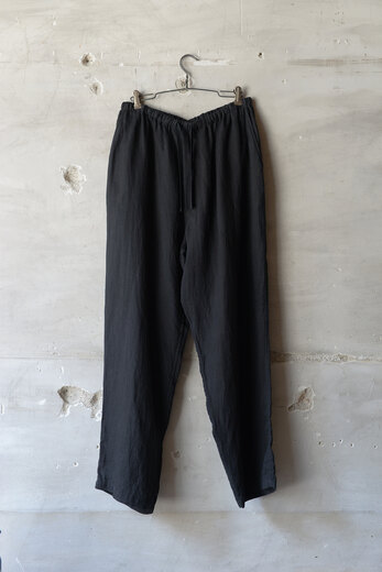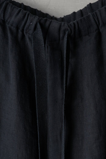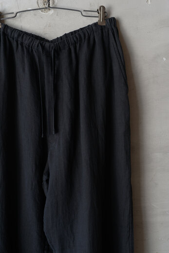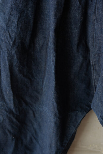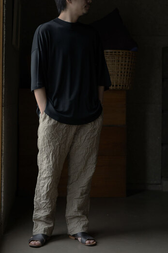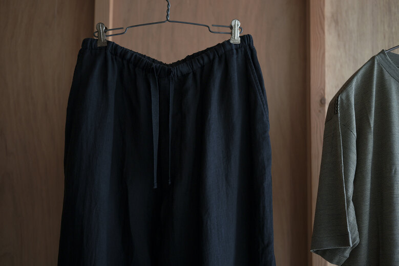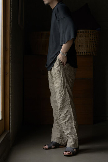 『夏に穿けるパンツがないです。』・・・理由を聞くと、年中穿ける物(ジーパンやチノパンや軍パンなど)しか持っていないらしく、年中穿けるという事はそれなりに分厚い生地だ。数年前まではそれでも何とかなっていたが、ここ最近の夏の暑さは少し辛い。だから夏だけのパンツの必要性が高まっているのではないでしょうか。コモリの夏のパンツは細番手の糸を二重織したリネン、薄手だけど膨らみがあって柔らかい。そして軽くて風通しが良くて涼しい。程良くリラックスしたシルエットは汗ばむ季節に快適さを与えてくれるでしょう。ウエストはゴムが入りアップデート、さらに快適に。
