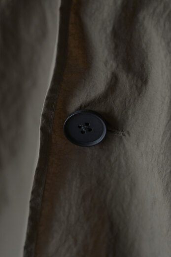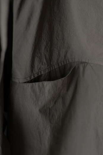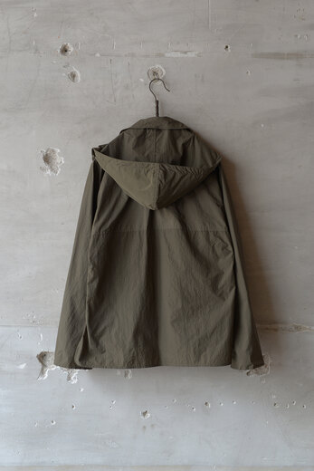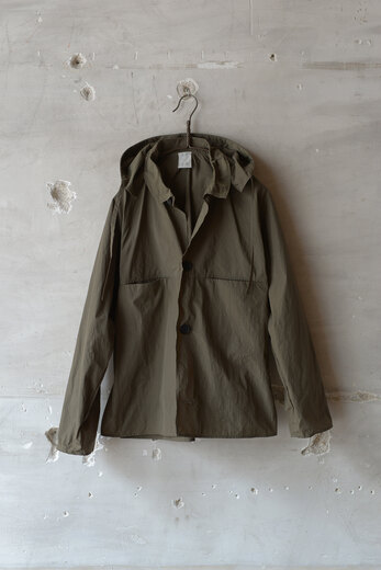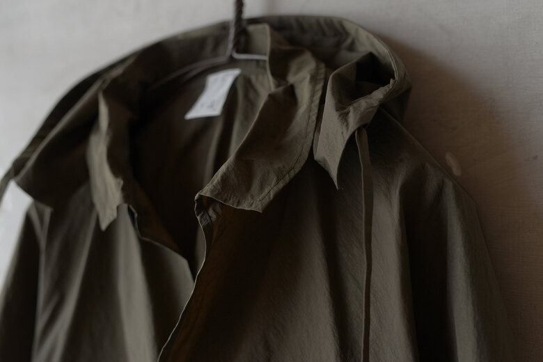 街着として丁度良いZERO BLOUSON。小さく折り畳んで鞄に忍ばせておけば、肌寒くなった時や雨がチラついてきたらサッと出してパッと羽織る事が出来る。ガーメントダイされたナイロンなので皺も気にする必要がなく・・この上なく気軽。そして実際の重量も軽過ぎてご試着された方達はびっくりされていた。素材の雰囲気だけでなく、アシンメトリーの襟や着脱出来るフード、動き易いパターンなどシンプルに見えるがとても考えられたデザインだ。こういう洋服は持っていると使う頻度が多い気がする。だから着ると気分も上がるし街着として丁度良い。