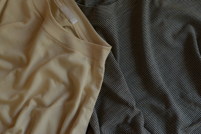 少し黄色味が強い卵のようなベージュとベージュがベースのボーダー。今年のコモリはベージュがキーカラーらしい。合わせ易いし、上品さも感じる。全くチクチクしないウール天竺は薄いけどしっかりしている。5年着た同素材のTシャツをお店に来られた方達にご覧頂いて、皆さんビックリされていた。全くボロボロになっていないし、柔らかくなって触り心地が良くなっていたからだ。ウールには体から出る水分の量によって体温を調節する特性があり、汗を吸ってすぐ乾くのでベタベタした感じがなく涼しいし冷え過ぎない、汚れたら気軽に洗える。そして長年着るともっと気持ち良くなる。COMOLIのウール天竺は夏の最適解ではないでしょうか。