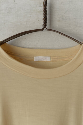 伸びる伸びる。リブ編みだから伸びる(伸縮性のある)、ウォッシャブルシルク。いつものフライスに比べるとズッシリしていてシャリっとしたドライタッチな触感。かなり大きめな作りなので細身の方から体格の良い方までこのサイズでカバーできる、と思い1番小さいサイズだけを選んだ。ウールともカシミアともまた違う気持ち良さ、元々体の一部だったのではないかと思う位、自分の皮膚にとても優しくフィットするような感覚がある。ご試着された方はなかなか脱ごうとはぜず、自分で試した時も脱ぎたいとは思えなかった。