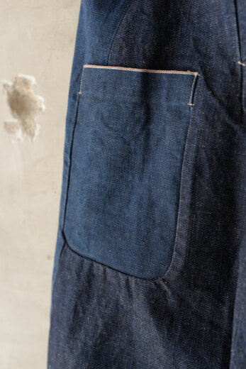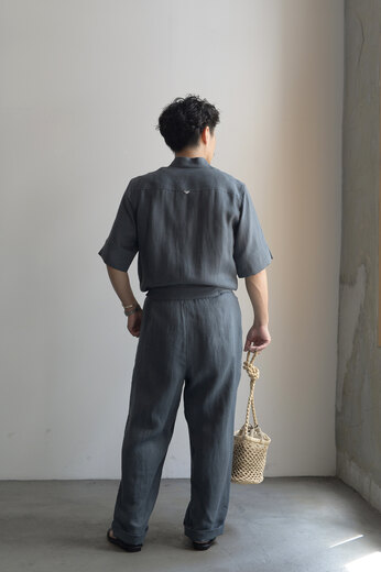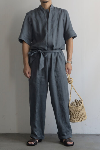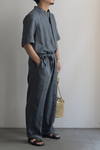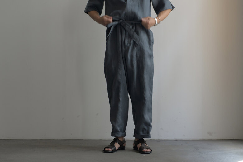 あまりの暑さにコーディネートを考える事が面倒に思う日がある。適当に着てしまいあとで後悔する事もしばしば。ツナギはその点ほぼ考えなくて良くて、セットアップの様なキッチリさもある。そんな日には重宝する洋服だと思う。1778年創業のフランスはサフィラン社の40番手リネン糸を使い、国内で綾織し通常のリネンよりも伸縮性とシワになりにくい特性を持たせたそう。さらに風速72mの風力で叩きつけて硬さを取り、古いリネンの様なプルプルっとした質感を再現した極上のリネン。フロントはジップ。サンプルはシングルジップで男性にとっては少し使いにくいのでは?と感じ、昔のパイロットパンツの仕様を思い出しダブルジップで提案した所、即決で仕様変更になったエピソードのあるジャンプスーツ。ベルトは前で縛ったり、後ろで縛ったりアレンジを楽しめる。清涼感のある洋服で夏を思いっきり楽しみたい。