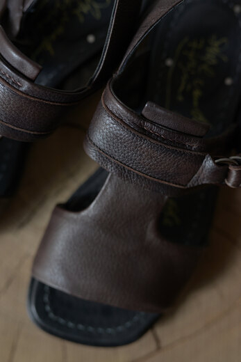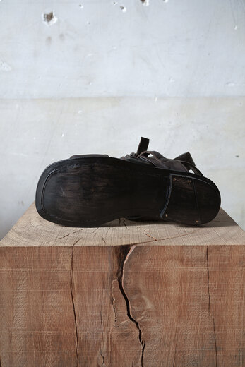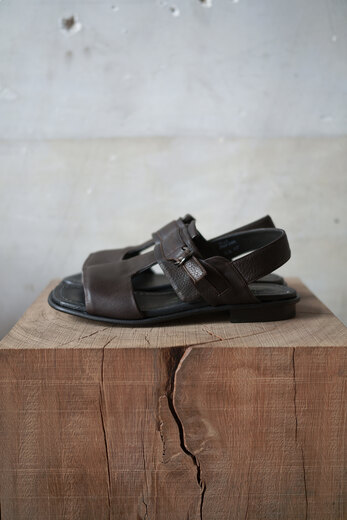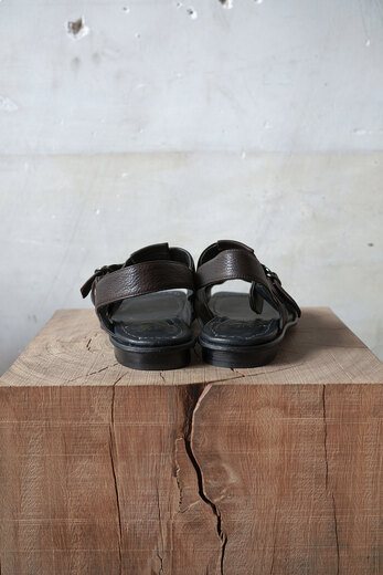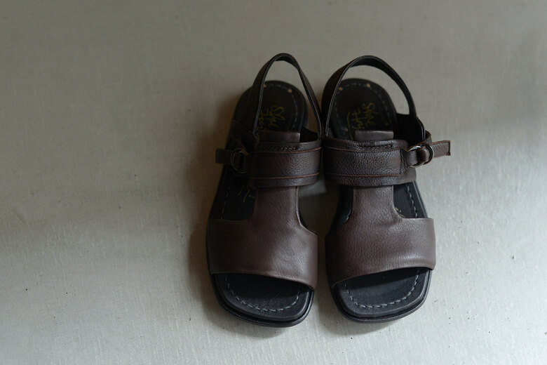 歩き易く、歩く事が楽しいと思わせてくれるそのみつの靴。色々な靴を履いているし履いてきたけど、妙な安心感がそのみつにはある。今年のサンダルは去年とベースは同じデザインでレザーソールにする事にした。蒸れにくく、通気性のあるレザーソールは涼しく快適。レザーはディアスキン(鹿革)、柔らかく軽く、モチモチっとしている。肌にあたる部分は全てディアスキン。アッパーは内縫いの2枚重ねで間に入るクッションのおかげで弾力があり心地の良い着用感。着脱も簡単で、踵をしっかり固定出来るので長時間歩いても疲れにくい。