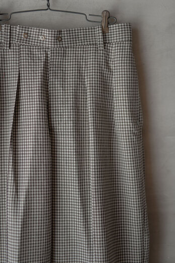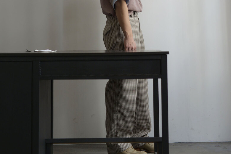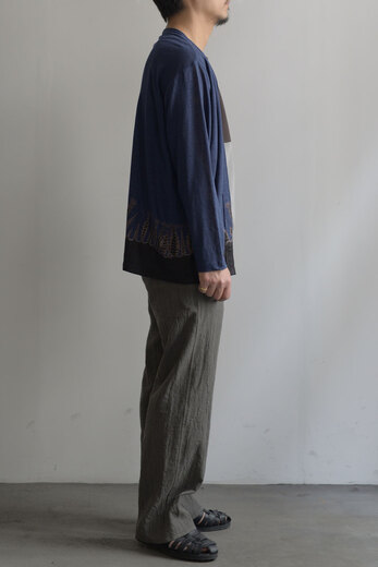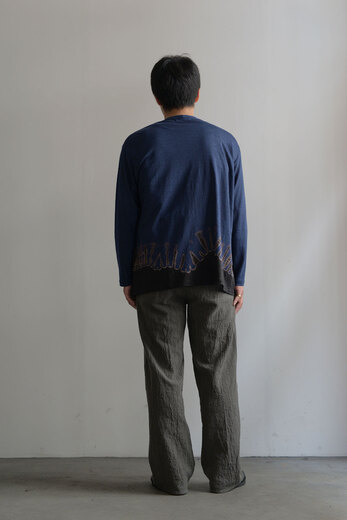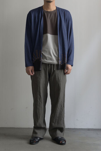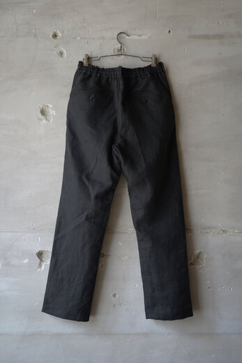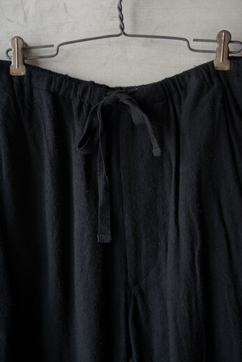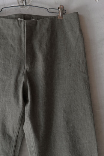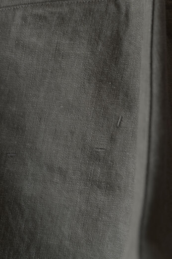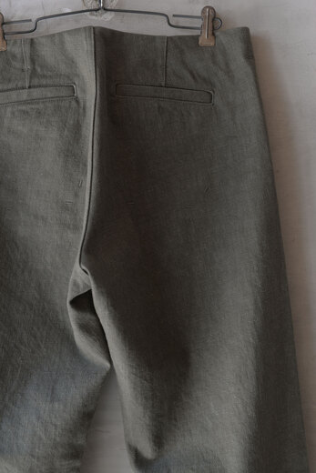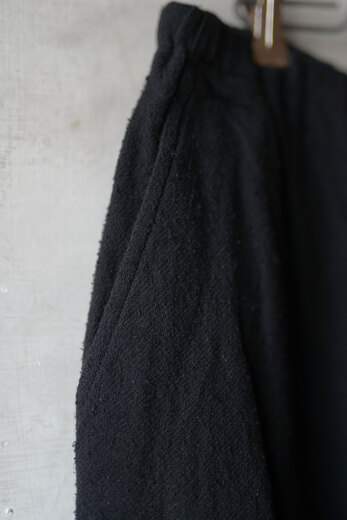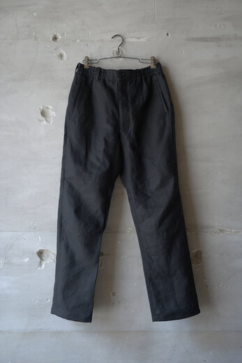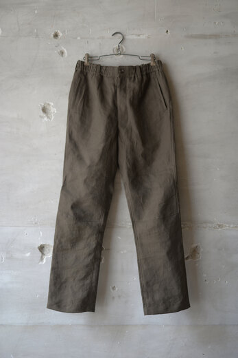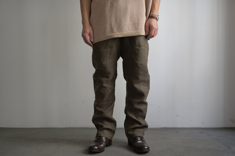 太いパンツを穿いていると細めのパンツが穿きたくなって、或いはその逆の場合もあります。それは甘い物を食べると辛い物が欲しくなる、みたいな感覚で。でもあまりにも極端に太かったり細過ぎるとちょっと照れくさい。山内の名作、立体切り替えパンツの後継にあたるこのパンツはそれをあまり感じさせない細かなパーツで構成された立体的なシルエットが特徴。ウエストはゴムとドローコードで細身だけど穿き心地はとても楽なのです。素材は元々はとても固い繊維のヘンプで、表面を微起毛させる事により肌あたりがとても柔らかく滑らかに。その表情がスエードのように見える事からヘンプスエードに。風通しも良く、汗をかいても乾きやすいので真夏にも最適なパンツです。