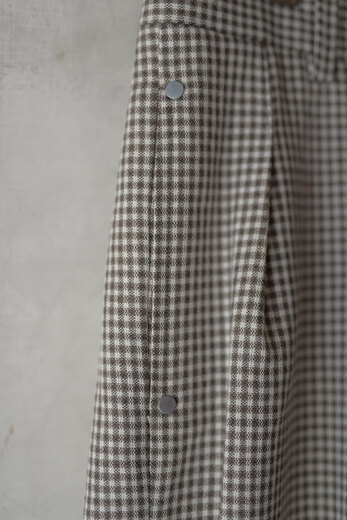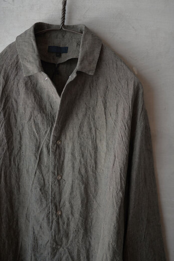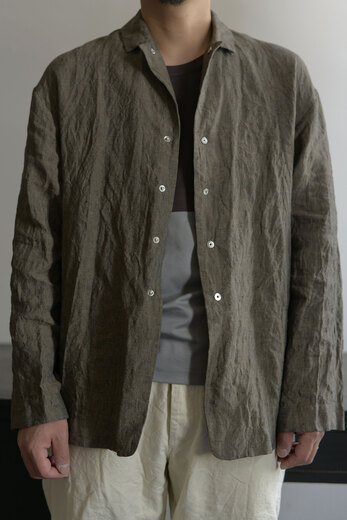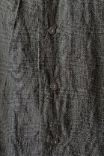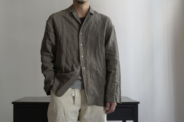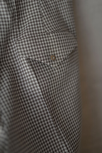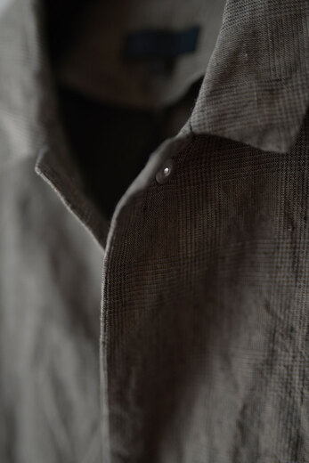 カーテン越しの日差しの強さやベランダの向こうに見える木々が緑色に染まっていくのを見て、季節が進んでいる事を実感する。朝と晩はまだまだコートが必要だが、日中はシャツやジャケット1枚が快適だと思えるようになった。落ち着いたグレンチェックが何とも上品なシャツジャケット。洗い晒しの麻は着る度に体にフィットしていきそうな柔らかさがあり、初めから使い古された労働着の様な雰囲気さえある。そして風が抜ける心地良さもあり、真夏でも全く問題なく使えそうだ。フロントのスナップボタンや小ぶりな襟、裾のラウンドした作りなどジャケットの様なシャツの様な・・・絶妙なバランスを保っている洋服だと感じた。