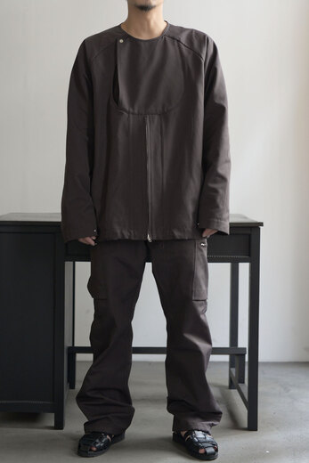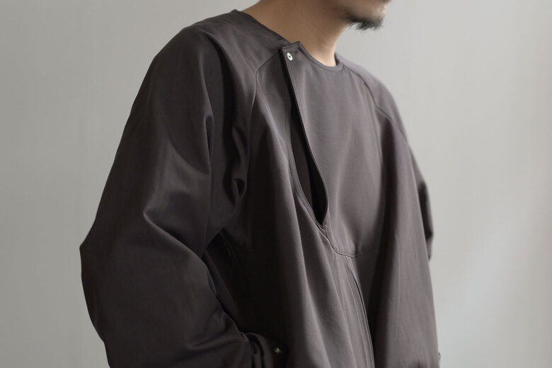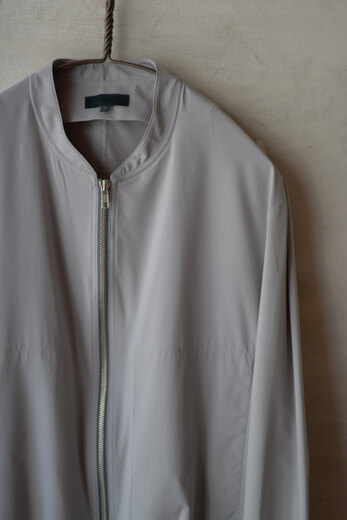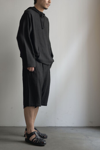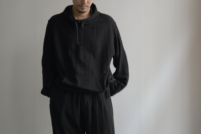 帰ってから服を脱ぎ(仕事の際に着る服)寝るまでの間(パジャマに着替える前)に着る服を探しているとお客様からお伺いした。それを聞き色々と考えてみた。その格好で宅配を受ける事も出来て家事もできる。近所のちょっとした買い物や散歩もできる。心地よさは絶対で、リラックスも出来るけどだらしなくは見えたくは無い。それで、都会にも行けるぐらいの面(ツラ)は欲しい。で、必ず自分のテンションは落としたくは無い。そういう意味で程よいバランスが取れる脱力感のあるこのパーカーはシルクネップビエラという素材で定番のシルクネップと比べるととても柔らかい。バシっと決めるときも必要だけど、時々ピーンと貼った糸を緩める事も大切なんだと洋服から学ぶ。