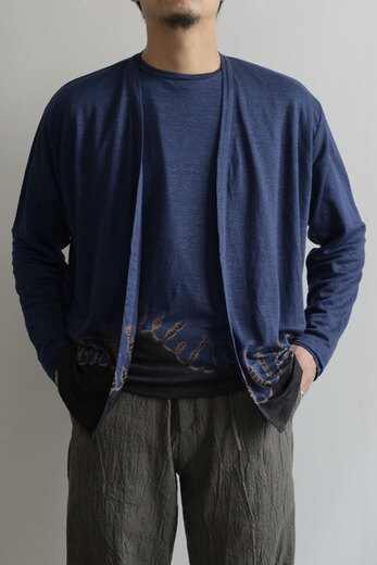 暑かった日に袖までもが煩わしく感じた。最近思う。夏は何を着ても暑い。しかし、やはりその中でもイチミクロンで良いから快適に過ごしたい。行き着いた先がタンクトップだった。タンクトップはまたご紹介するとして、確かにまだタンクトップで過ごすには躊躇する場もある。その時にパサっとスマートに羽織れるストール的な羽織があれば良いのになと思っていた。suzusanのカーディガンはリネンでどんどん心地よくなる。肌にまとわり付かず快適に過ごせるし、日差しを直に受けるよりも涼しい。生地や染からかsuzusanの持つ背景からか、とても”粋”な雰囲気がある。是非ノースリーブにカーディガンを。
