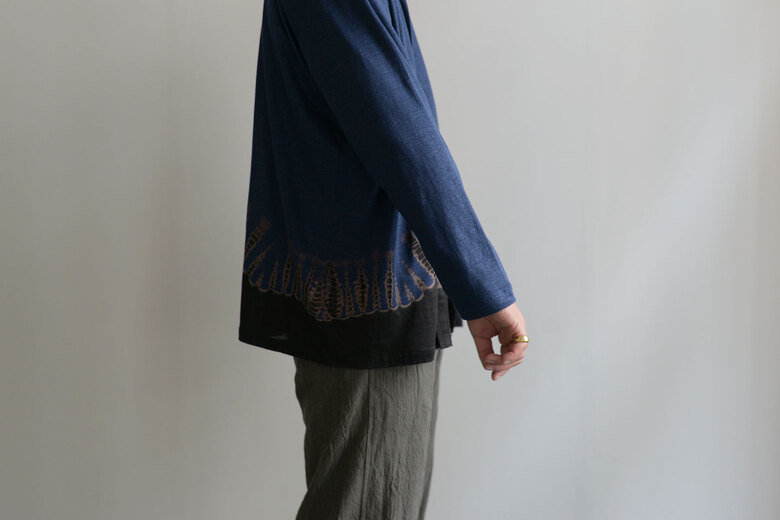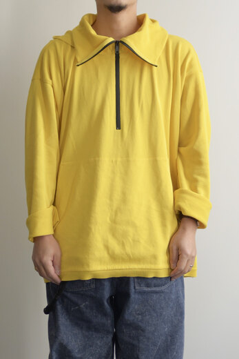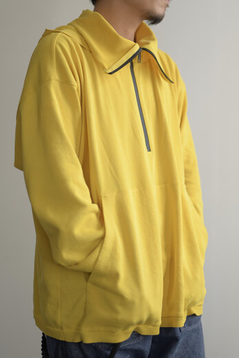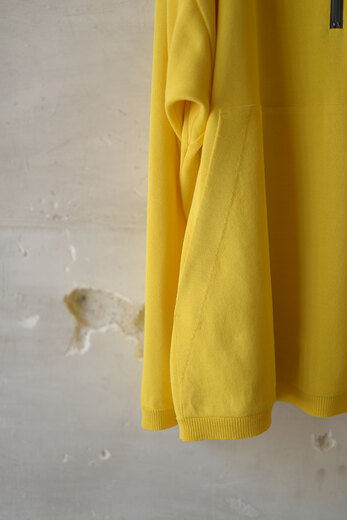 あるお客様が、シワシワのジャケットを見ると欲しくなる。と言った。あるお客様はチェックってだけで欲しくなる。言った。そしてとあるお客様は黄色いものを見ると手に取ってしまう。と言った。皆さん好きはそれぞれある。鮮やかで綺麗な色というのは見ているだけで心が躍る。このニットはZIPが長く程よく開ければ襟になりセーラーシャツのような雰囲気にも似ている。後ろには大きめのフードが付いている。シャリっと涼しい和紙、オーガニックコットン、再生されたポリエステル、沢山の糸が贅沢に使われていて、しっとりしていて心地よい。芝生の上で友達とワイワイとはしゃぐ時や息子さんと公園で遊ぶ時。そんなちょっとわんぱくに動く時に着たい、そんな気分のHoodie。